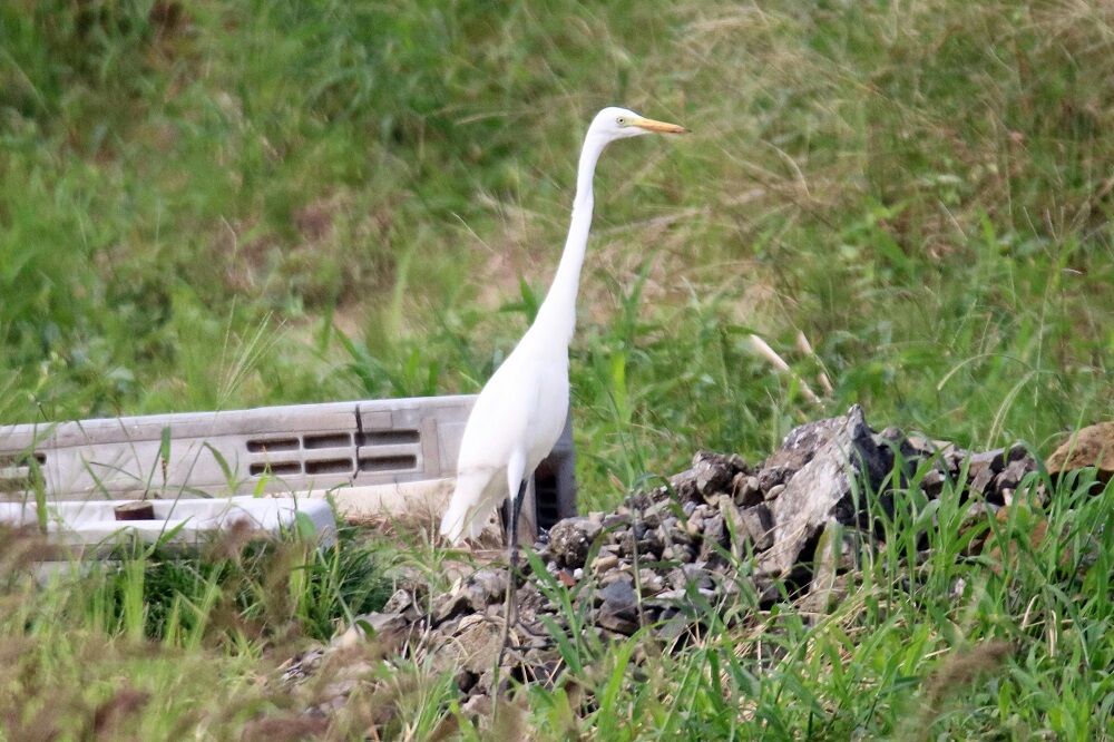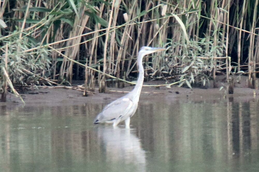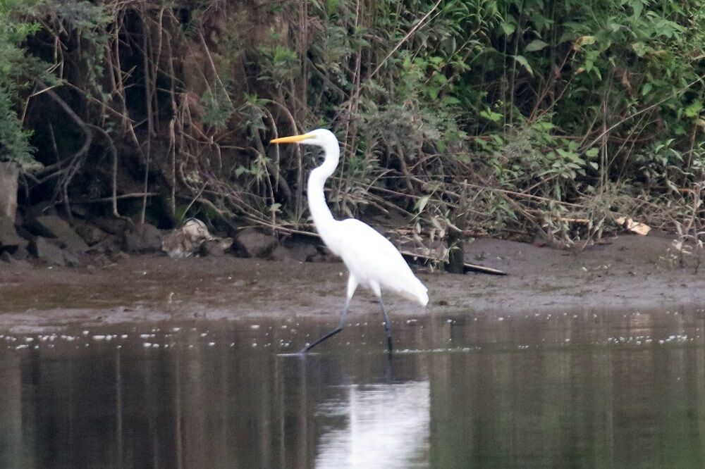 ここから引き返します。土手には数羽のアオサギがいましたが、近付いた事で飛んでしまい、この一羽のみが残りました。災害時船着き場の対岸にはダイサギがいました。