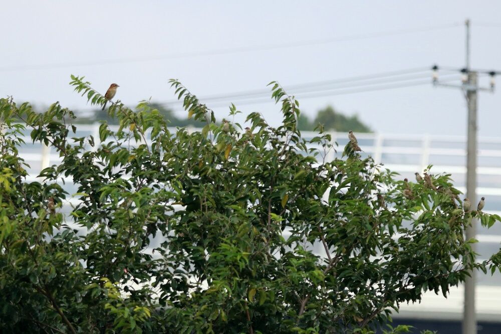坂川付近の田圃に生えている木にはスズメが沢山います。一羽のみモズも混ざっていました。