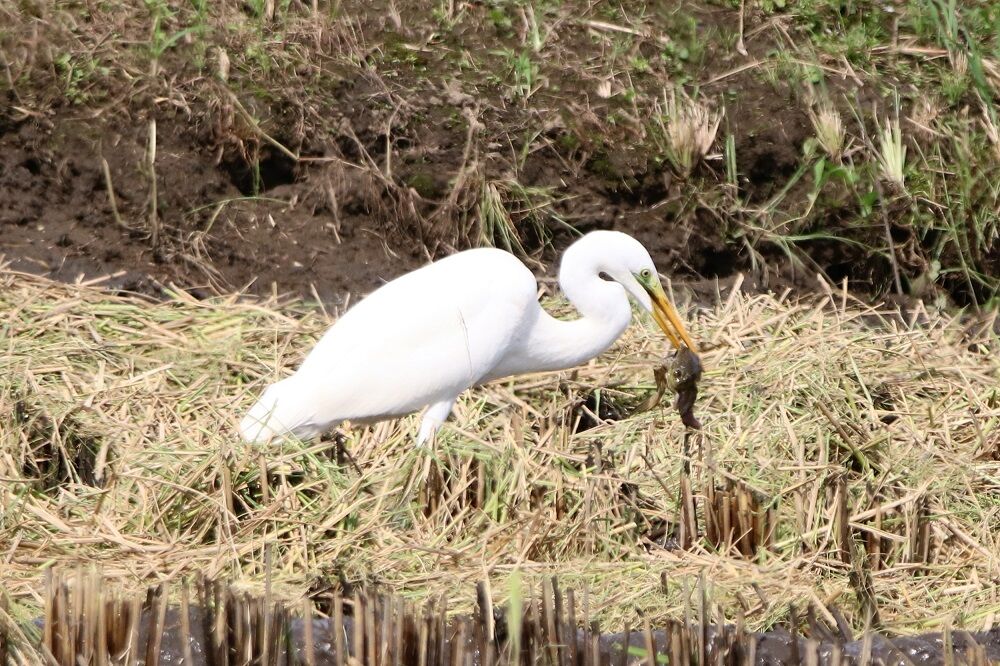 ダイサギが何か大きいものを咥えています。一度地面に置き、咥え方を調整します。