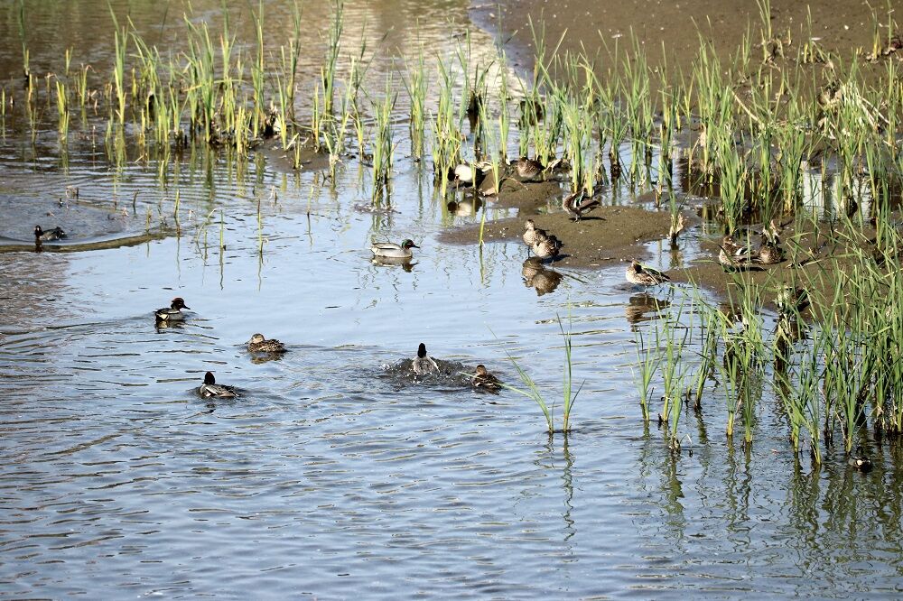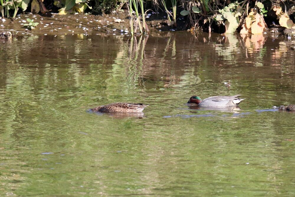 しばらくは2羽が近づいて行動していました。高杯橋より先を見るとコガモの集団がいました。