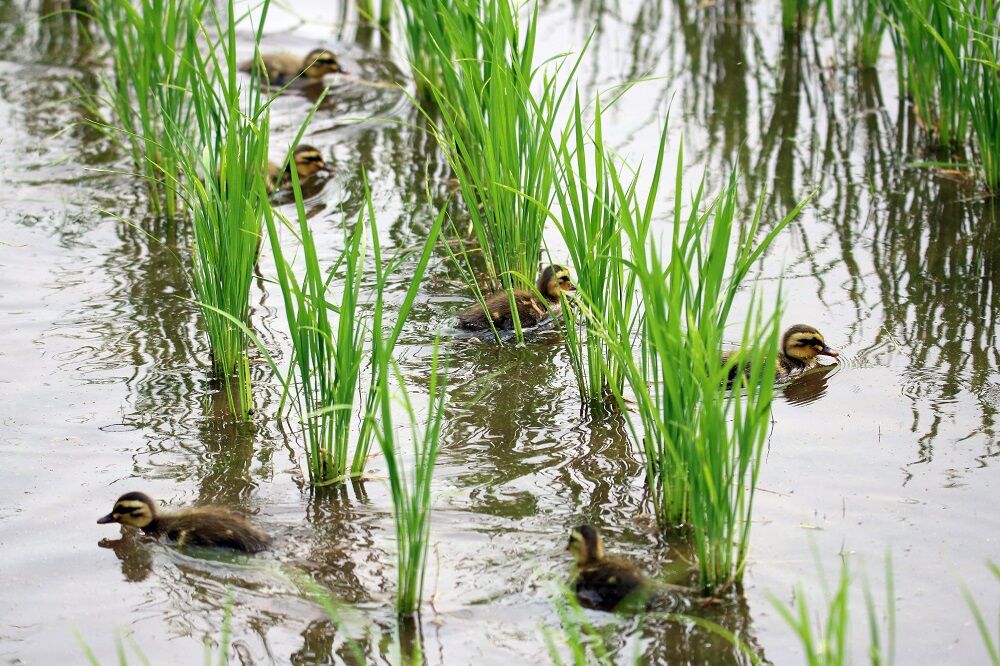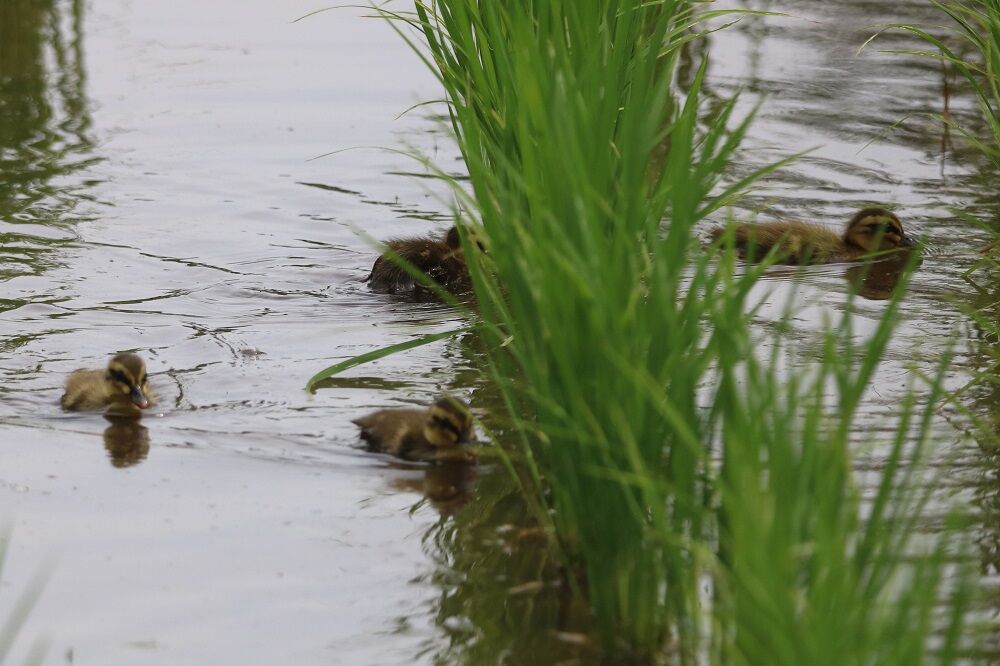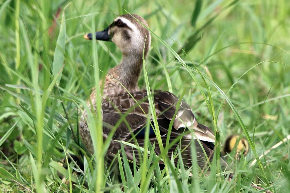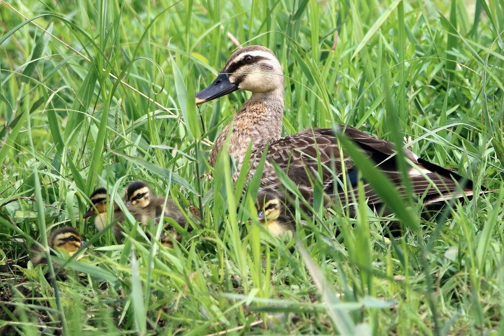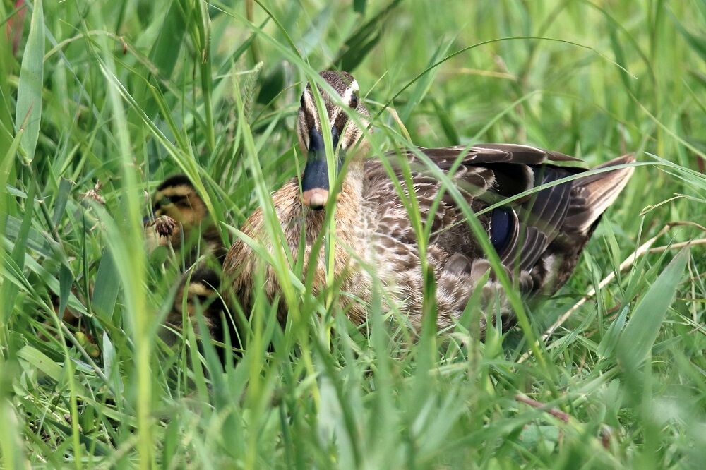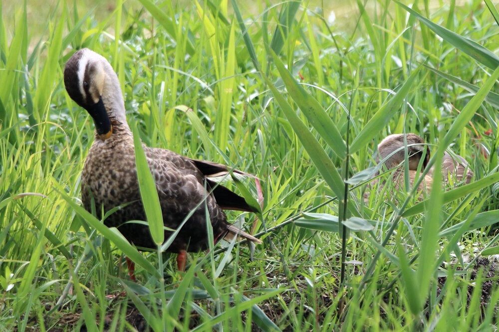 田んぼ近くの草むらの中にはカルガモがいました。ヒナもいます。