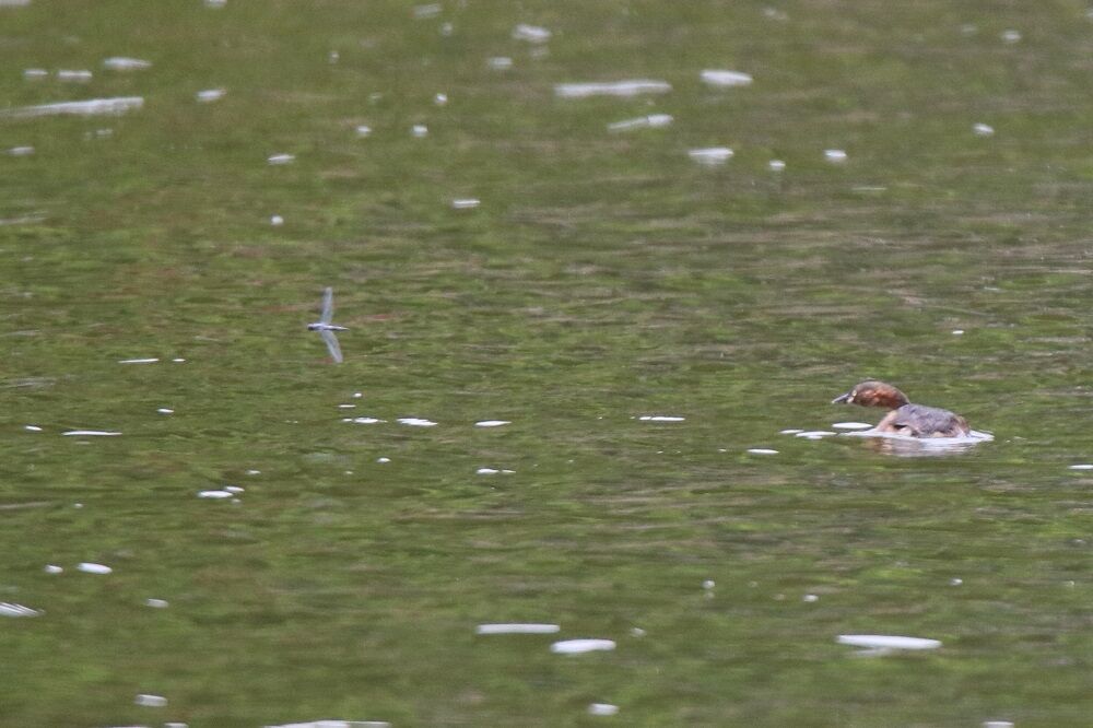 カイツブリが先ほどより近い位置まで来ていました。トンボを気にしていました。