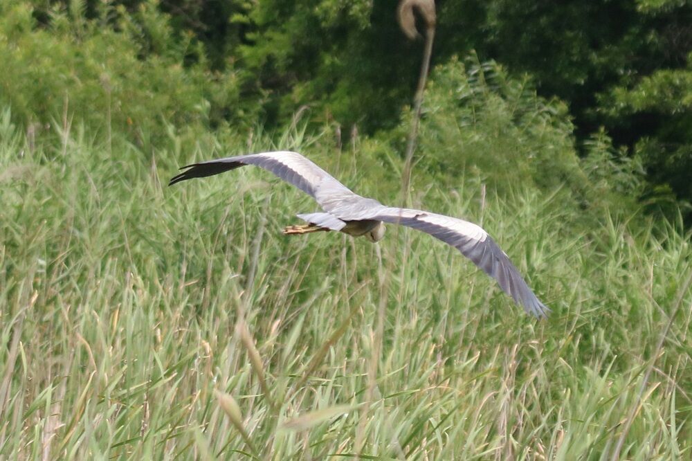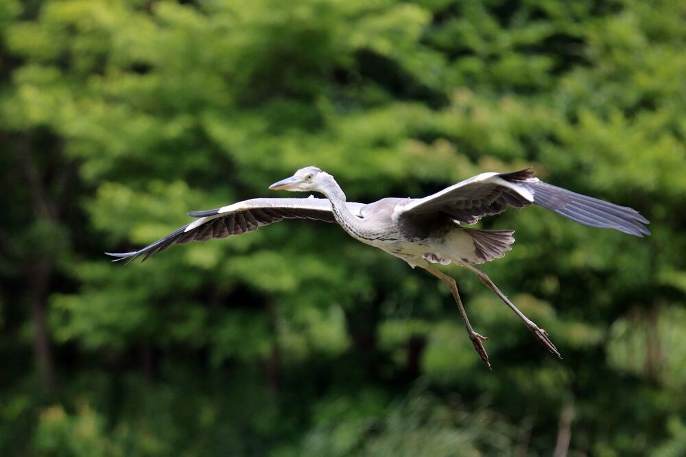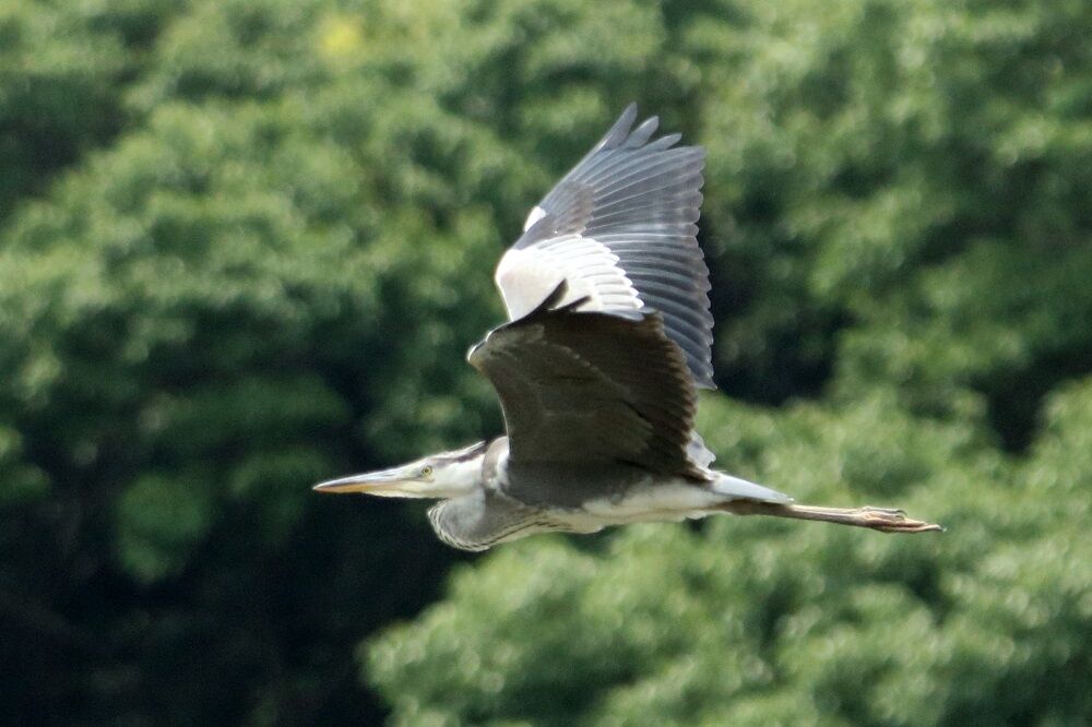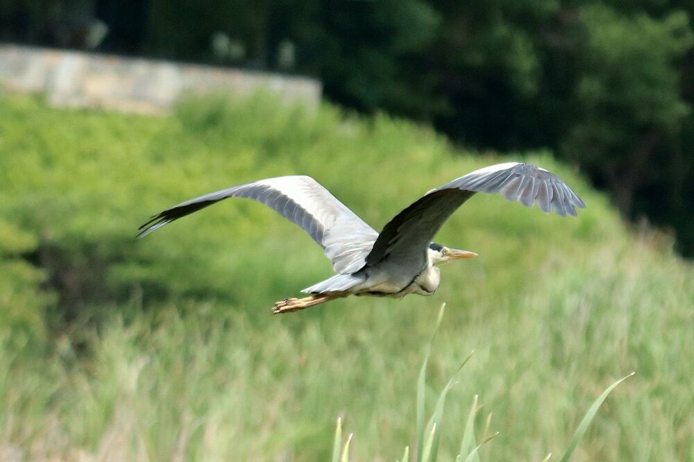 池から飛び立つアオサギがいました。