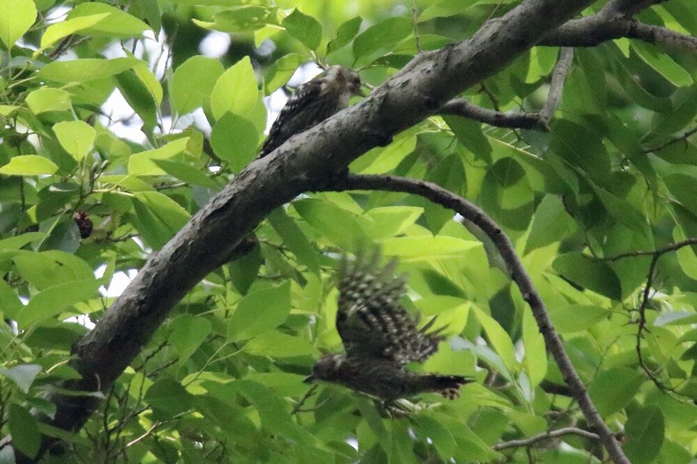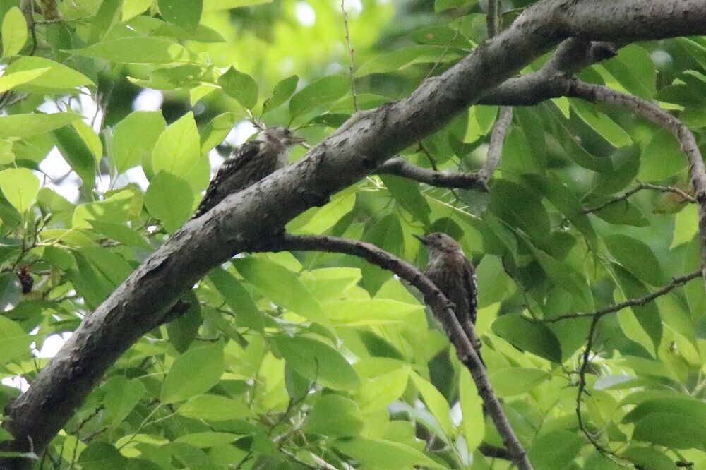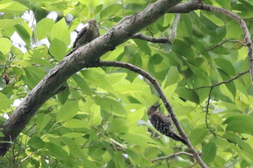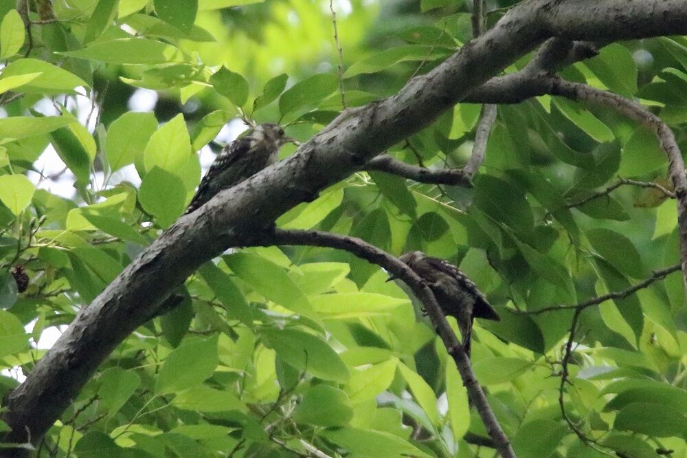 木の枝の中には2羽のコゲラがいました。