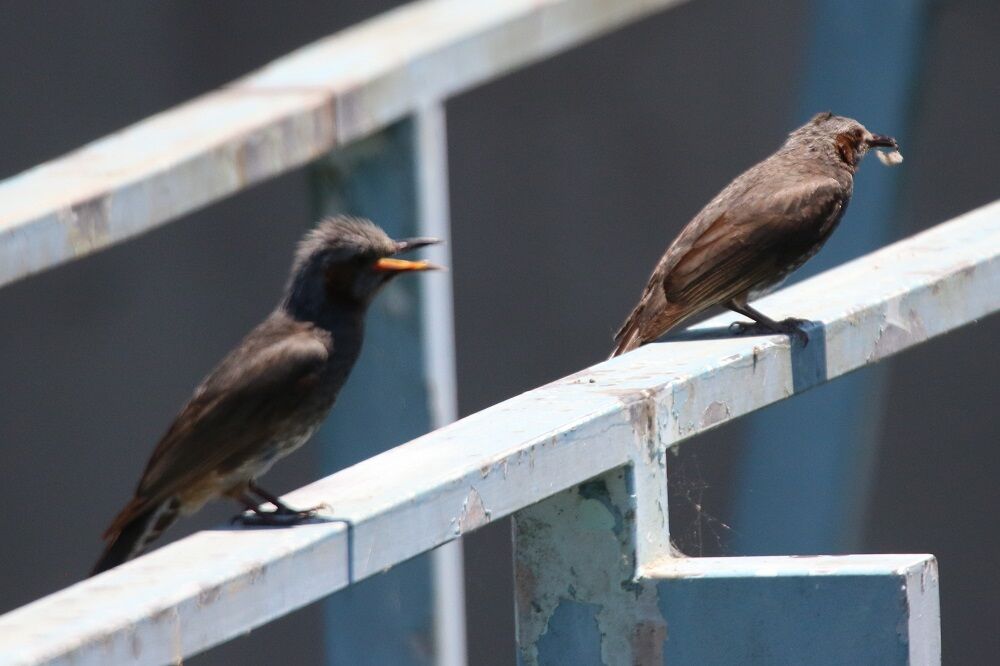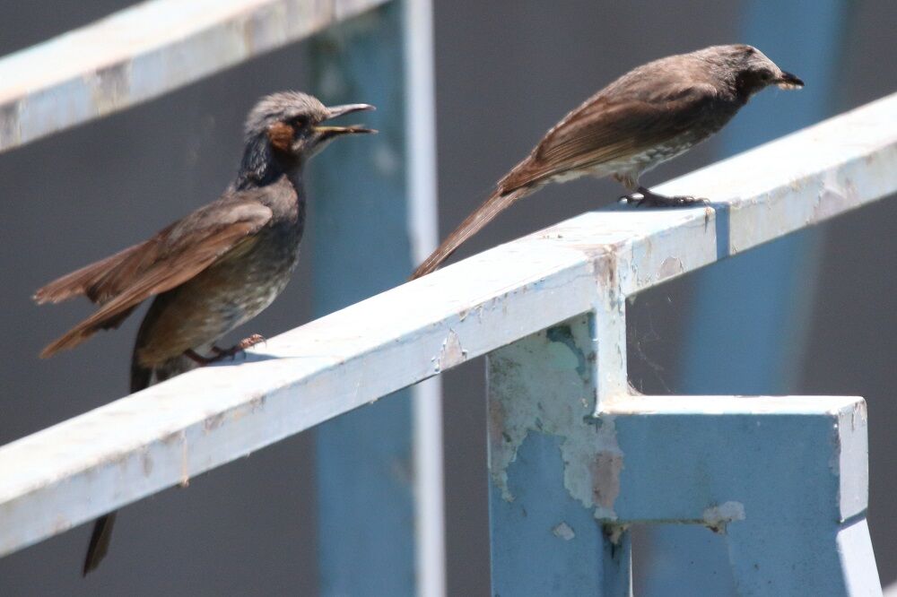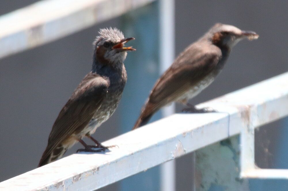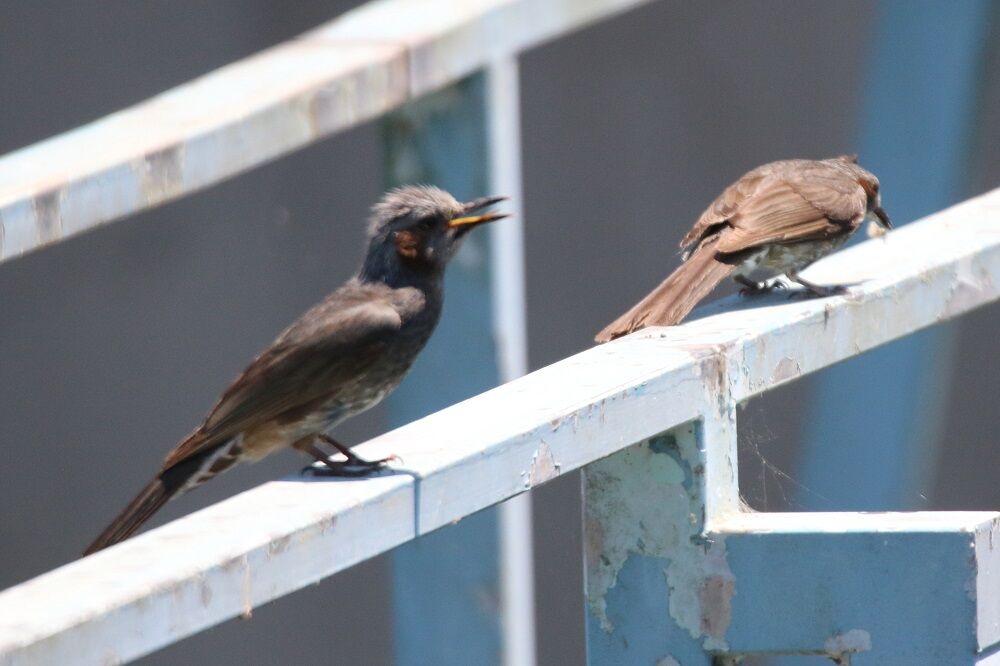 柵の上にもヒヨドリがいました。手前側にいるのが、ヒナでしょうか。餌を強請っていました。
