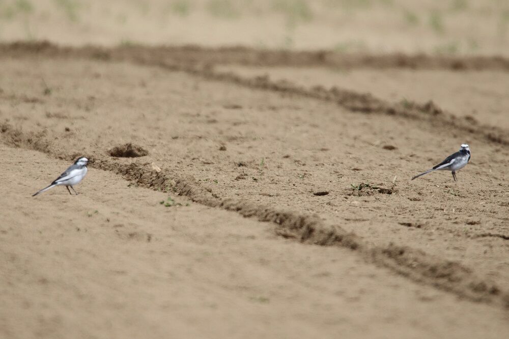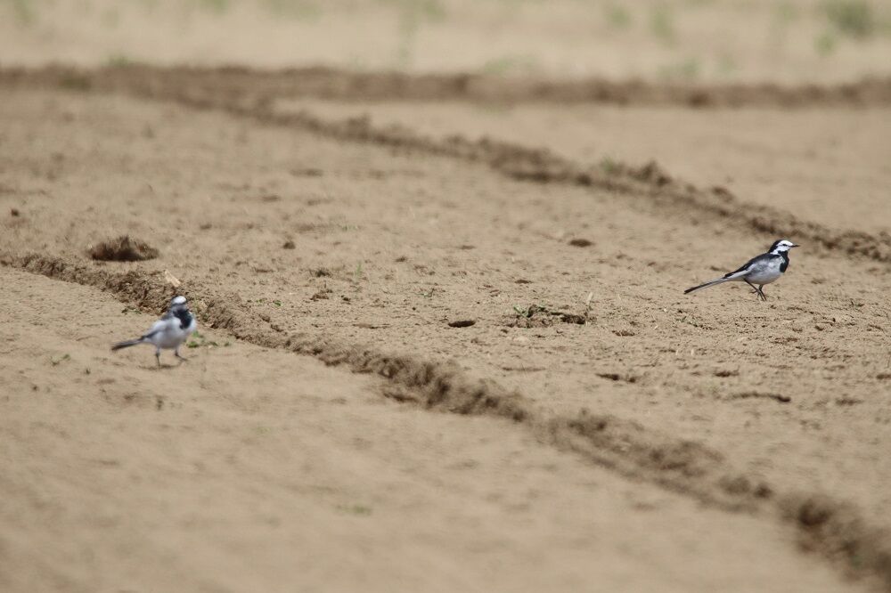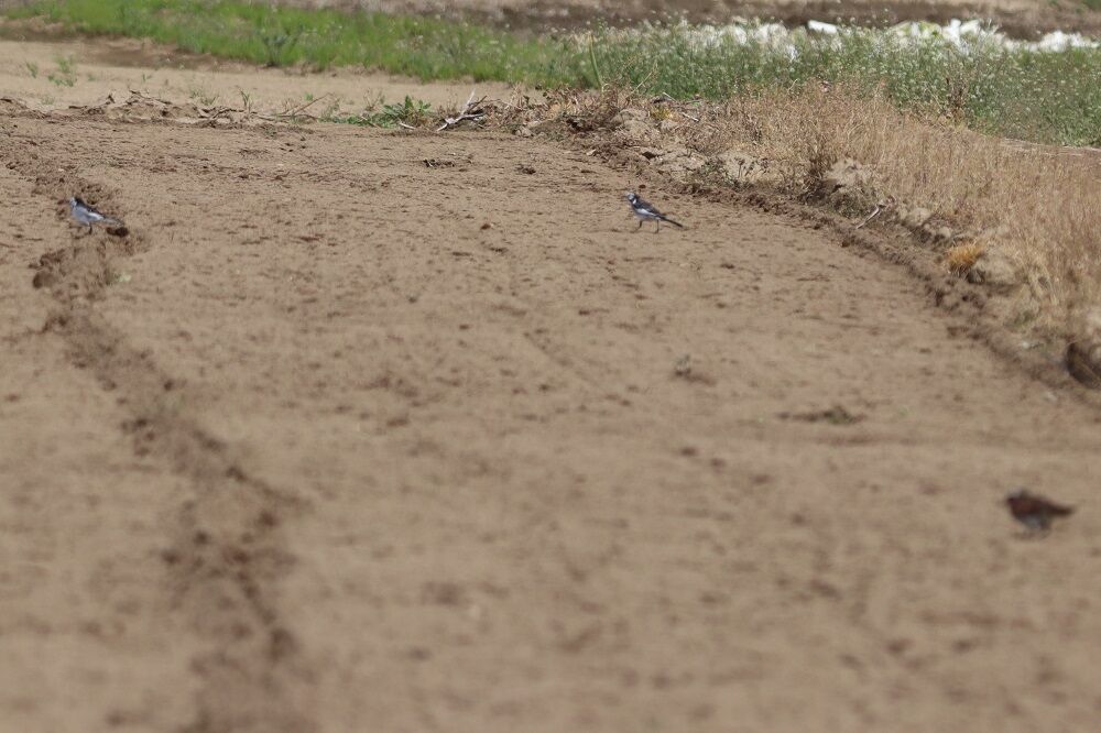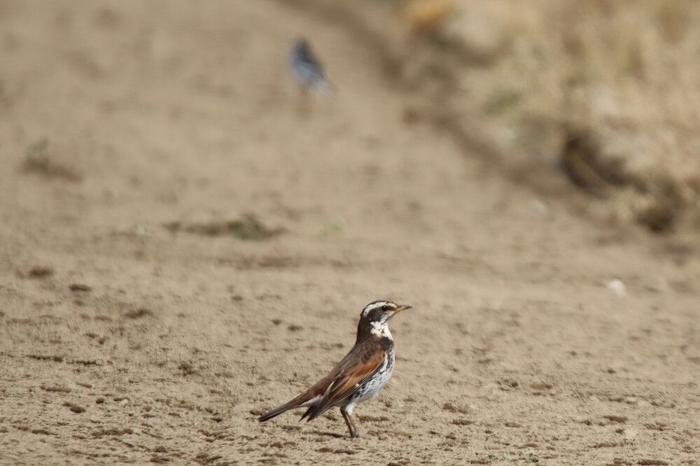 ツグミがいました。その後ろには2羽のハクセキレイがいました。