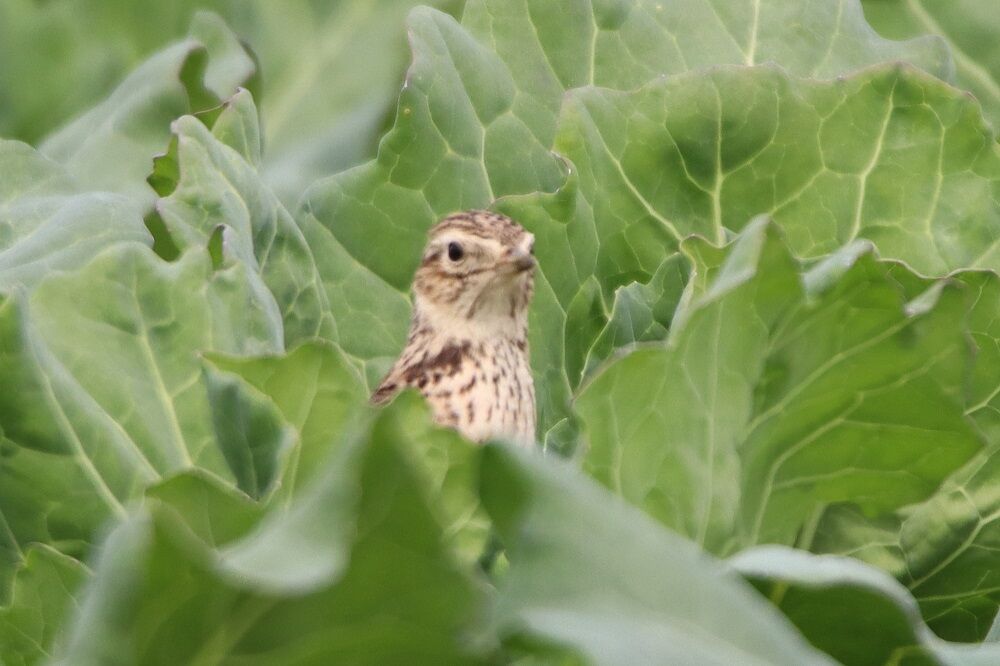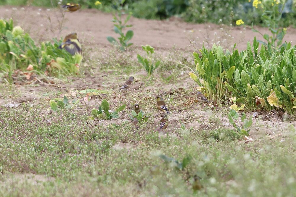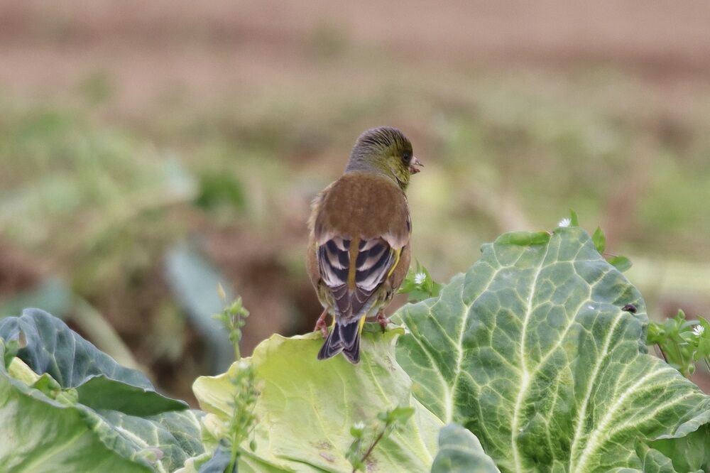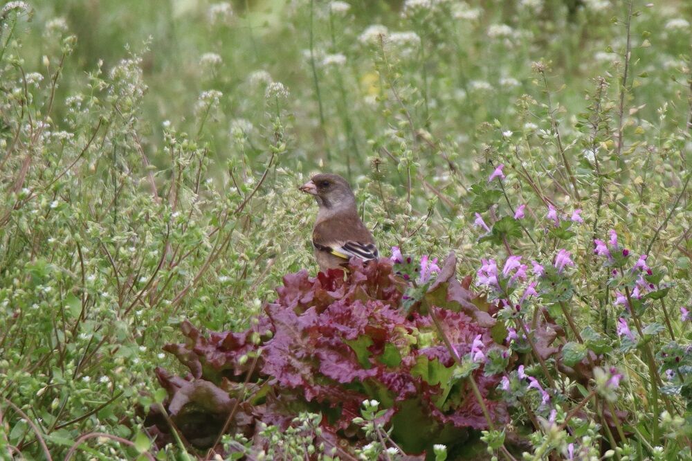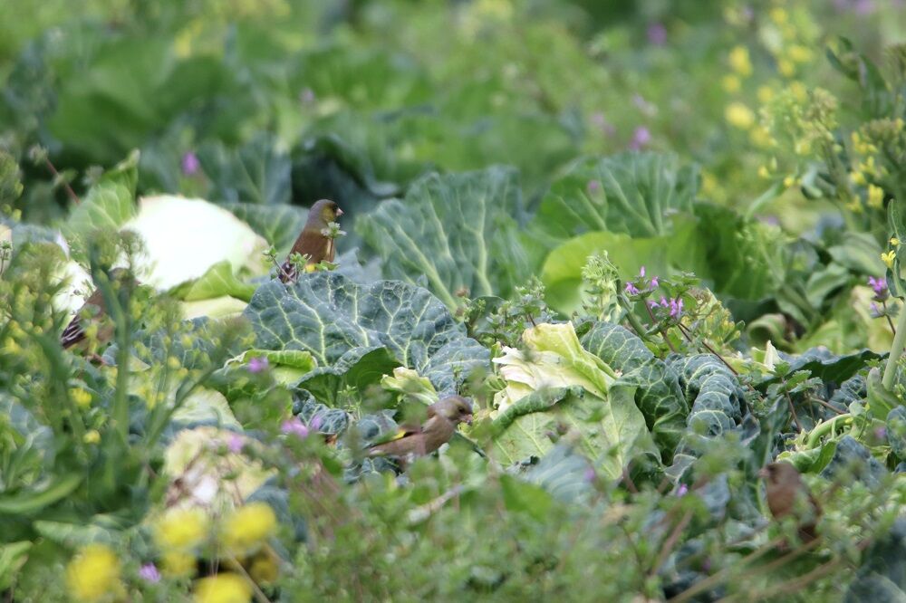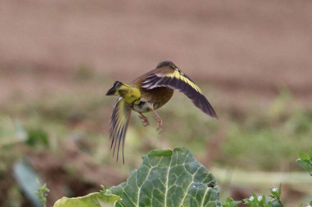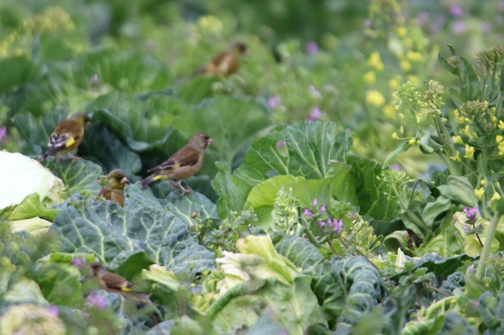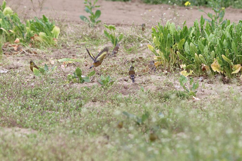 畑の中の農作物の上にはカワラヒワがいました。すぐに飛び立ちます。