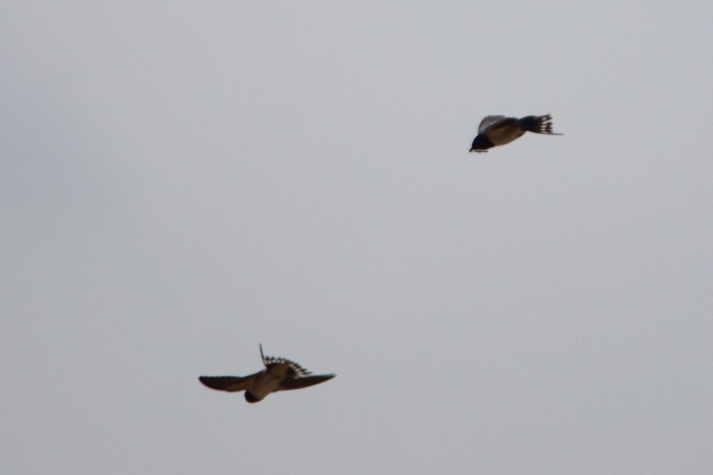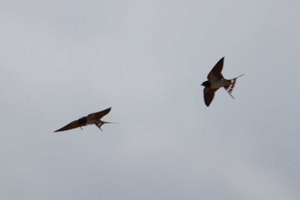 2羽のツバメが近寄って飛んでいました。一羽は嘴に何かを咥えていました。