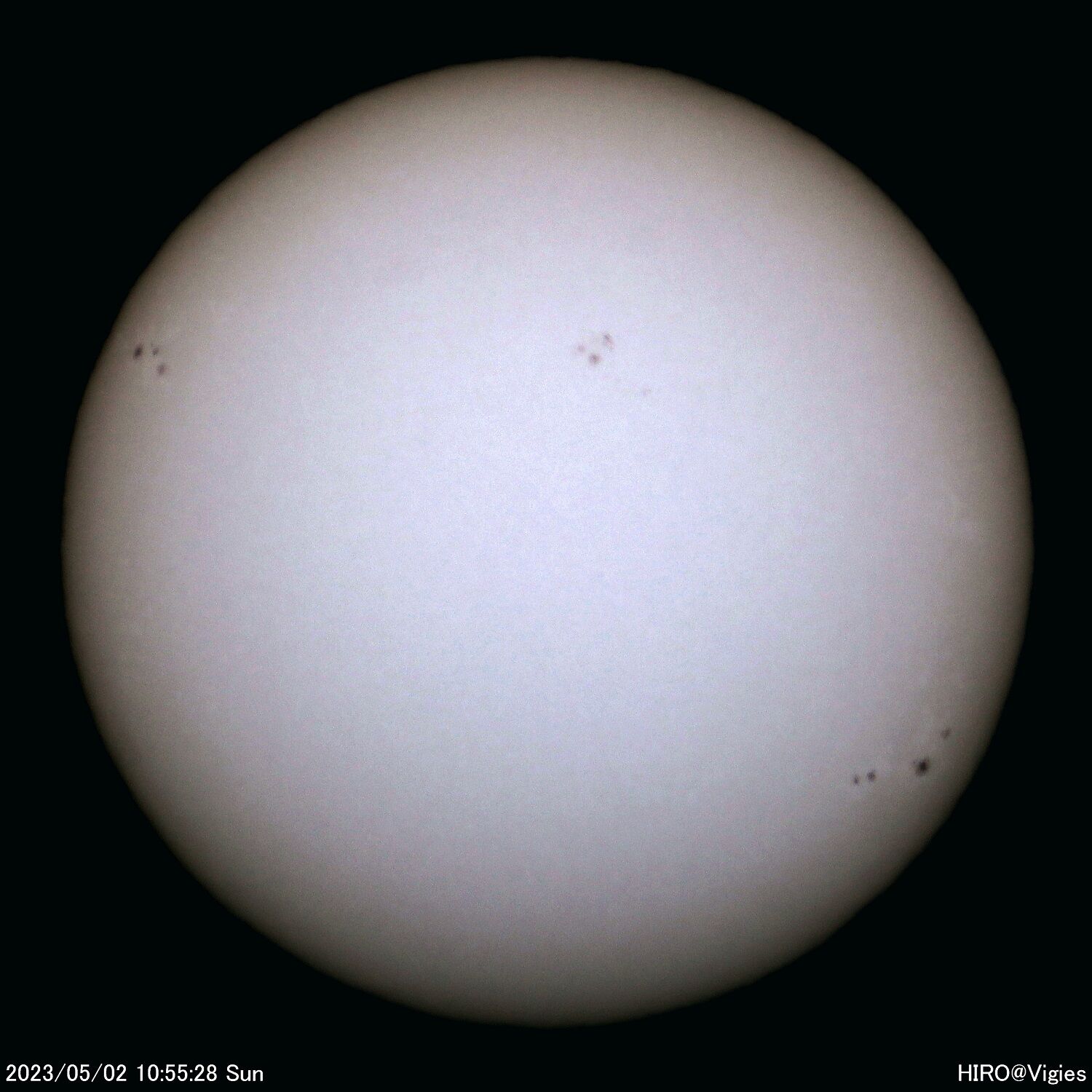 2023年10月28日 令和5(2023)年5月2・3日の太陽観測 5月2日(火)、3日(水)の太陽観測です。この日を含め、今後は連日の太陽観測が行えました。両端にある黒点は濃く鮮明に見えていて、真ん中付近に見える黒点は淡く、衰退しているようです。西側(右側)の黒点は裏側に回ってしまい、じょじょに見えなくなくなっていきますが、反対側の東側(左側)から多くの黒点が出現していました。この日は以上になります。 「天体観測」カテゴリの最新記事 < 前の記事次の記事 > コメント コメントフォーム 名前 コメント 記事の評価 リセット リセット 顔 星 情報を記憶 コメントを投稿する