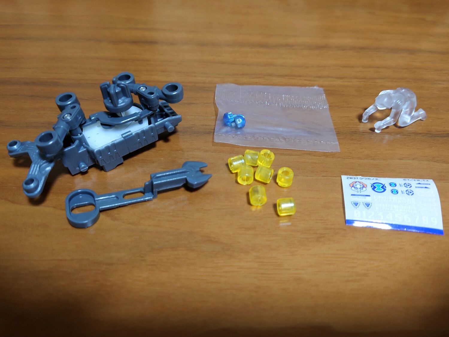 Sパックにはゼンマイリンクユニット、クリアーイエローのZキャップ、ブルーのアイパーツ、ライダーフィギュア、ラベルが入っています。発掘パックAは明けるといきなりパーツが出てきます。ここに入っているクワガタムシの牙っぽいパーツは使用しません。