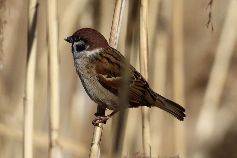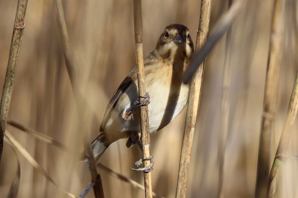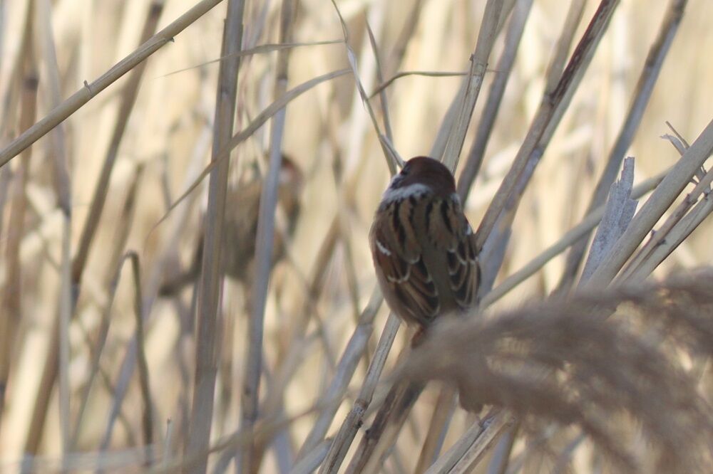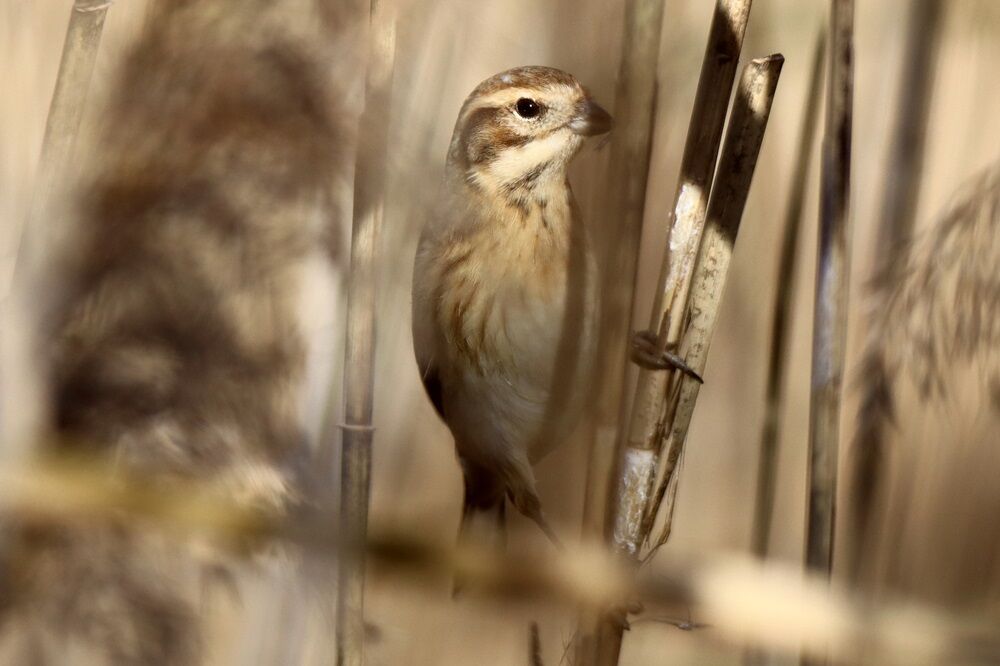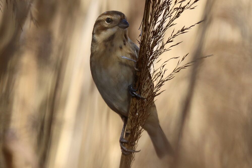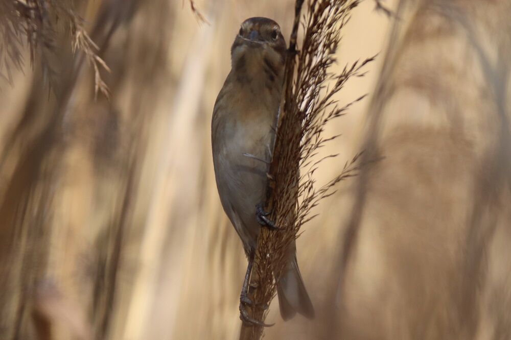 自然観察センターを出て干潟周辺を進みます。葦原の中から何か音がします。やはり、オオジュリンがいました。