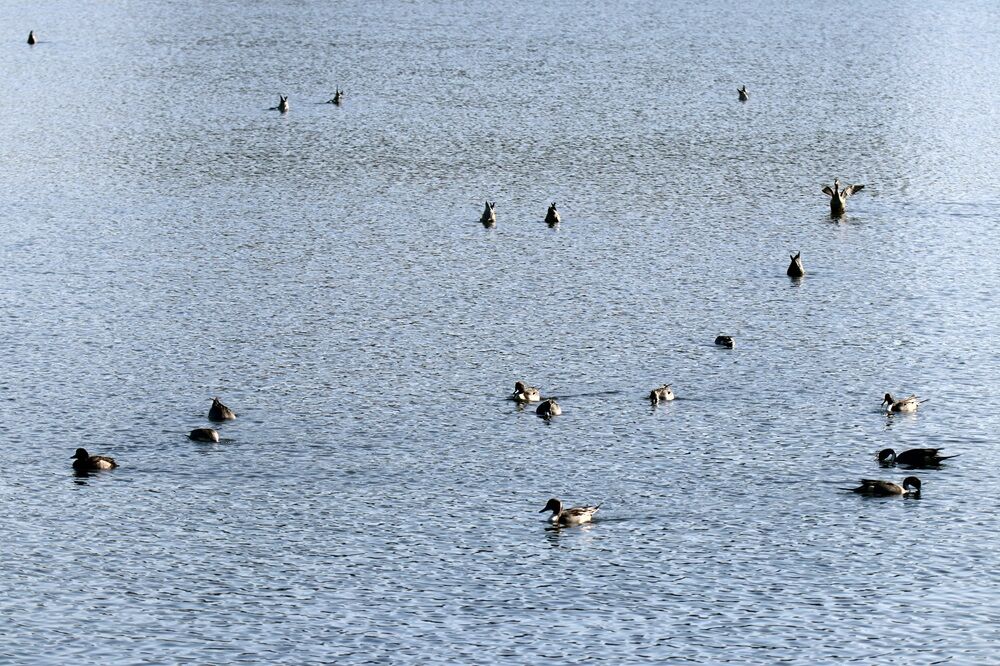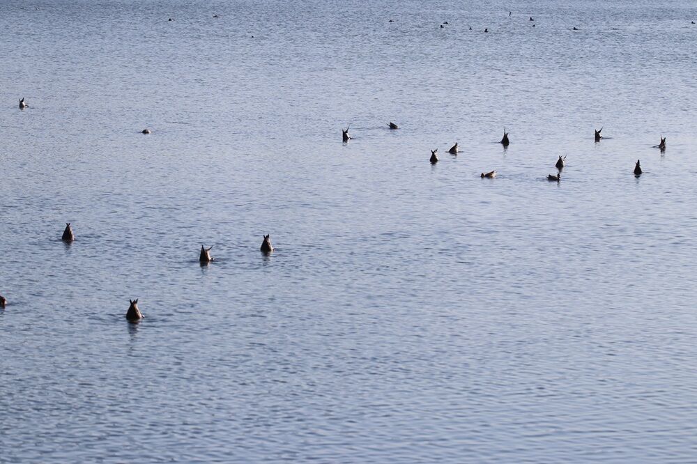 海ガモたちも増えました。タケノコ状になって採餌しているカモたちがいました。