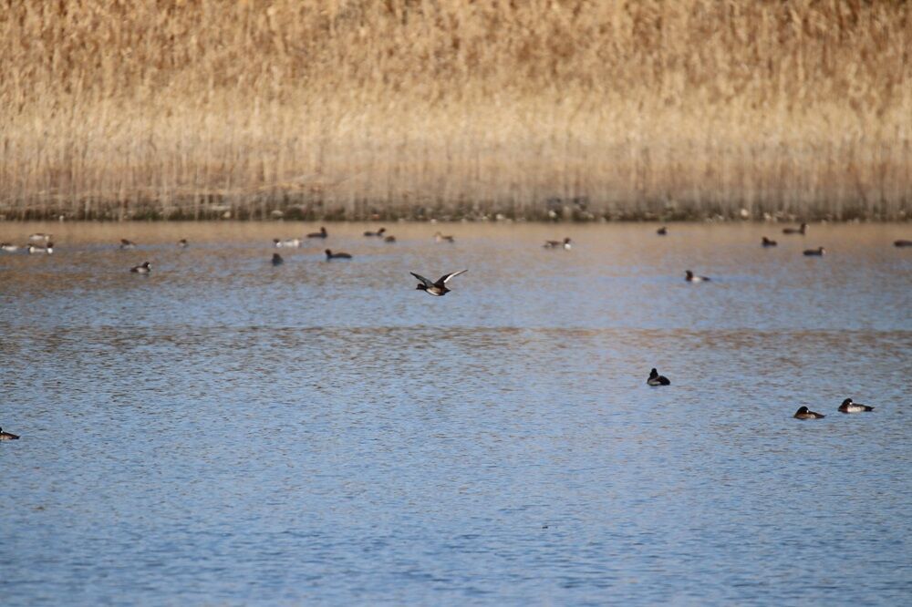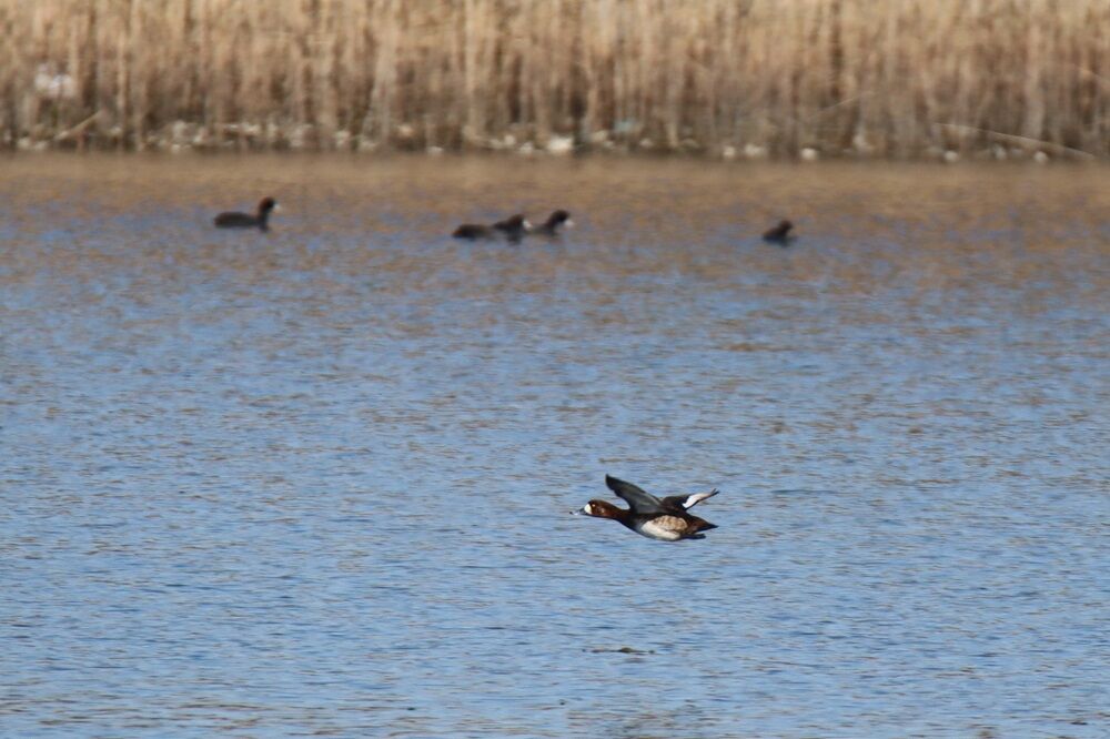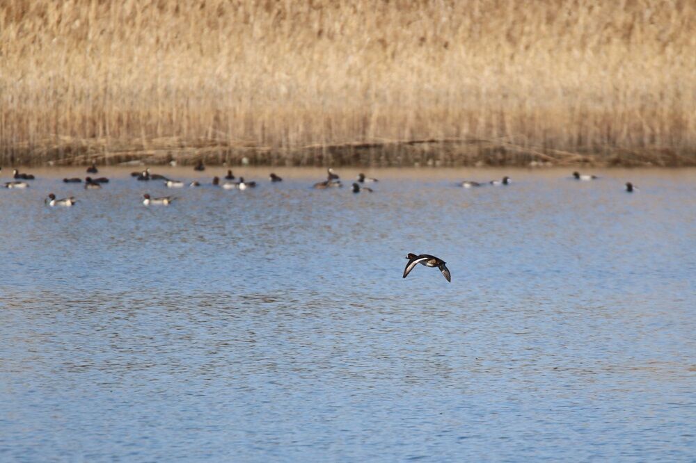 サギやカワウがいるエリアです。飛翔しているのはスズガモのメスです。
