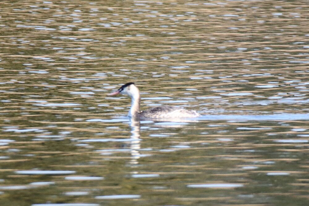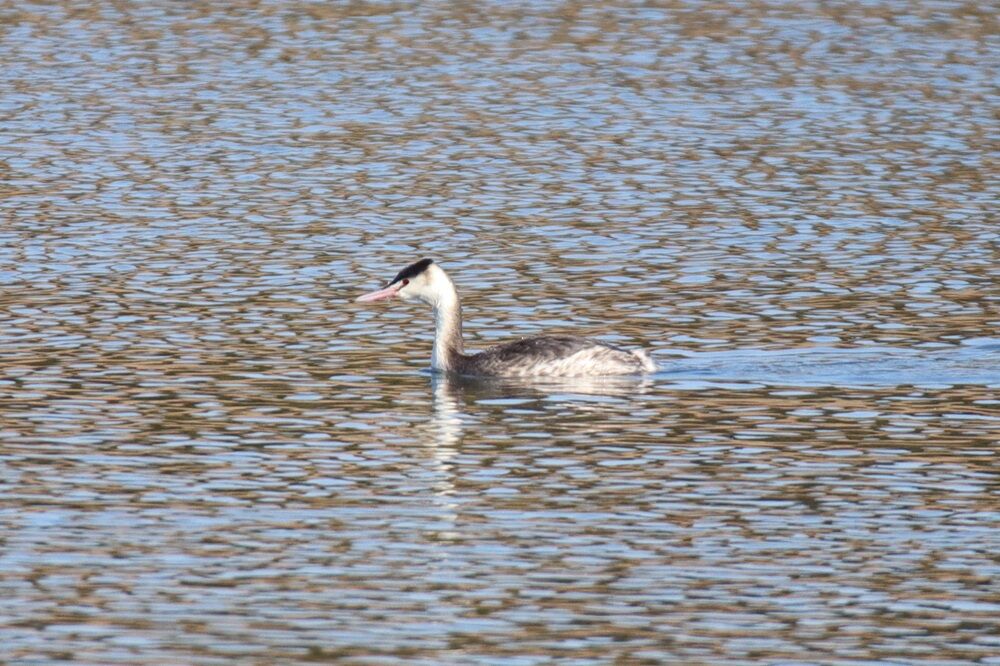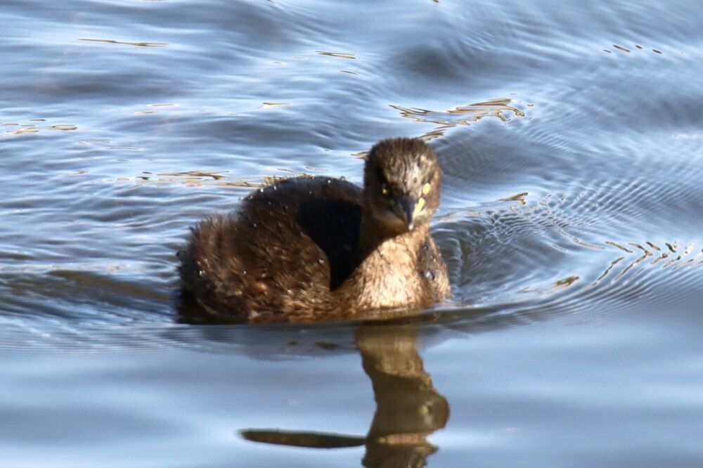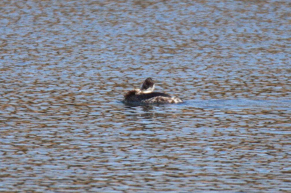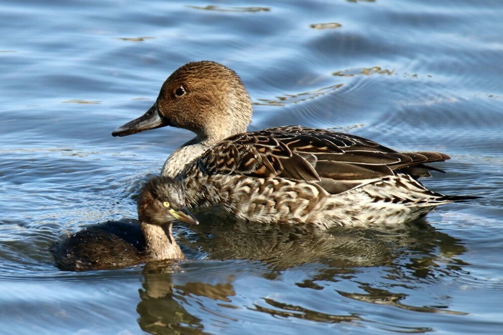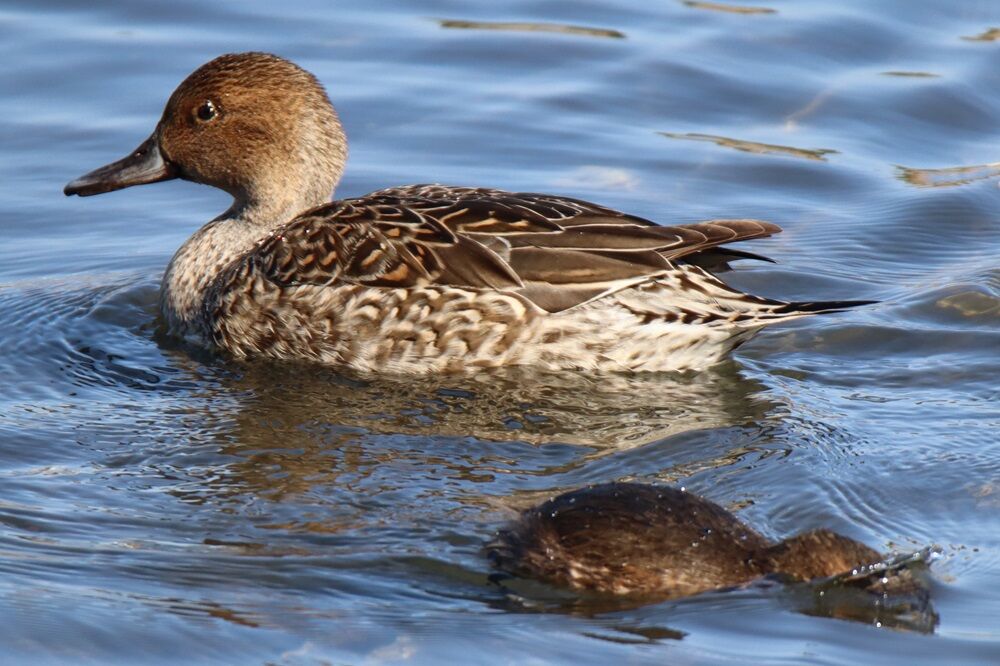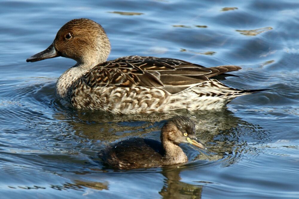近くにはカイツブリが現れました。そのカイツブリの近くにオナガガモのメスが来ました。