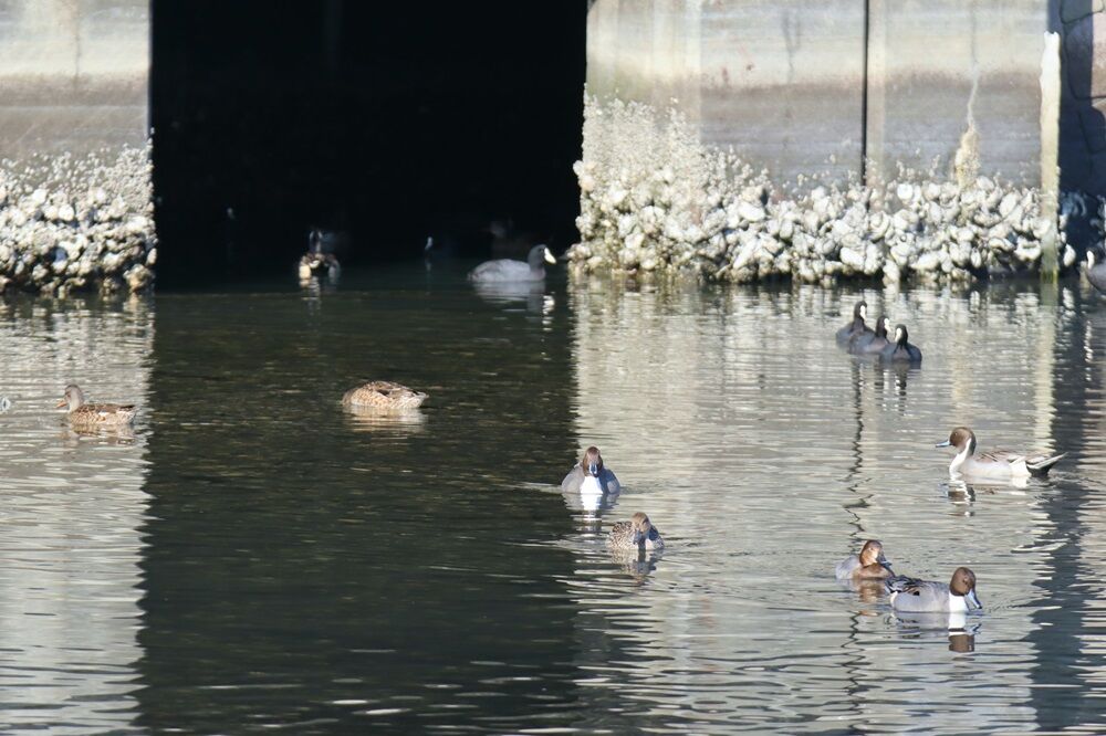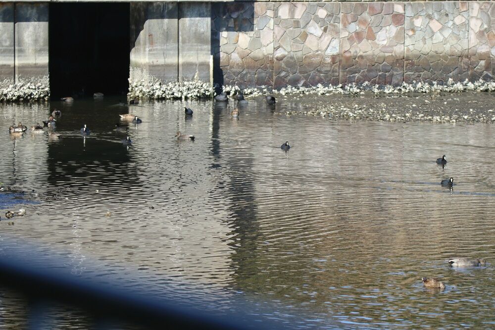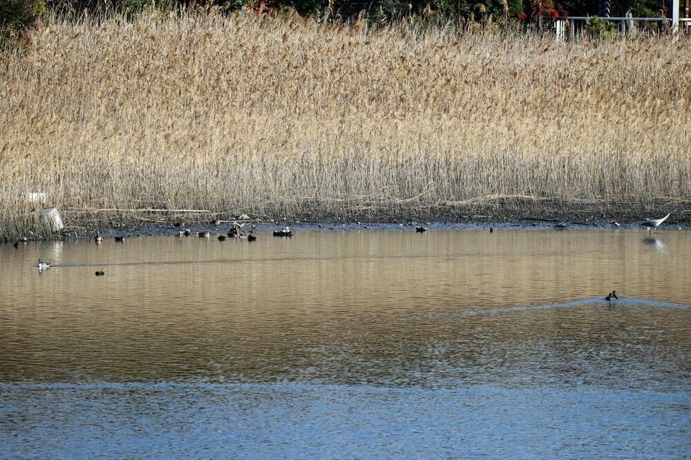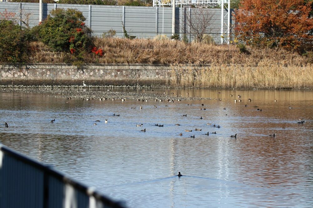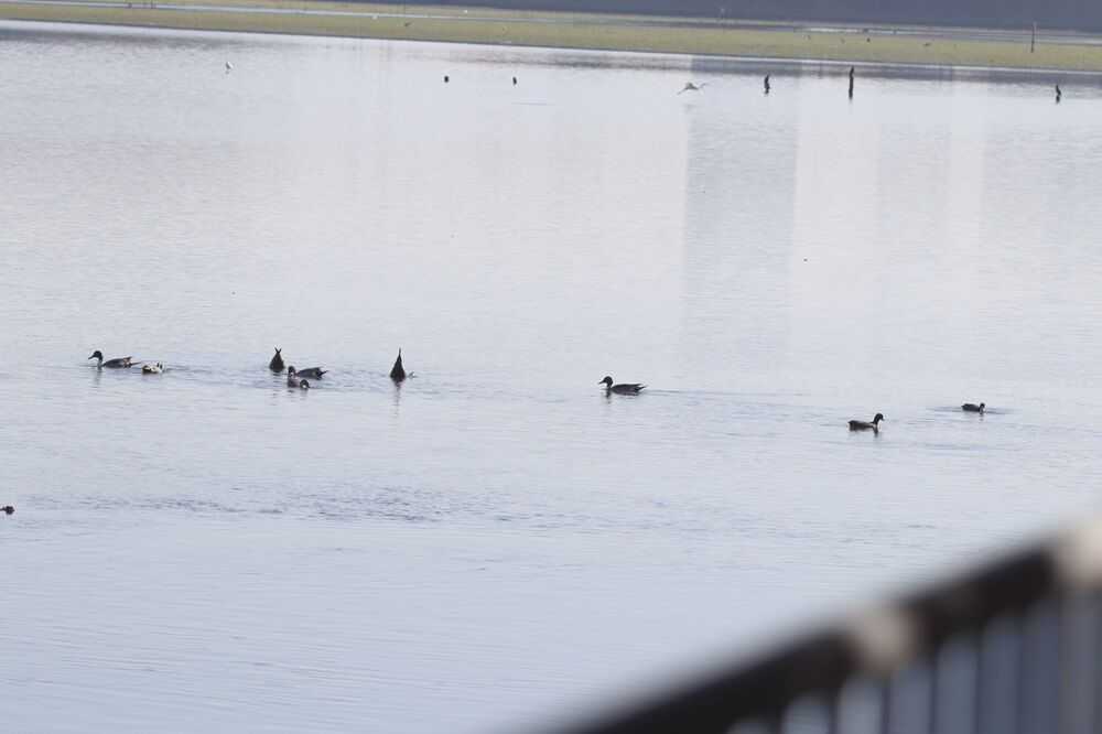 南船橋駅から谷津干潟の遊歩道に入ってすぐのところ、まずはオナガガモの集団がいました。対岸にもカモたちの集団、アオサギがいました。