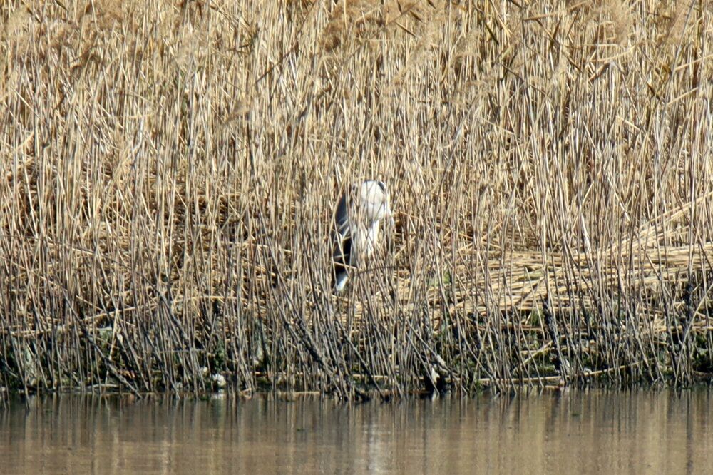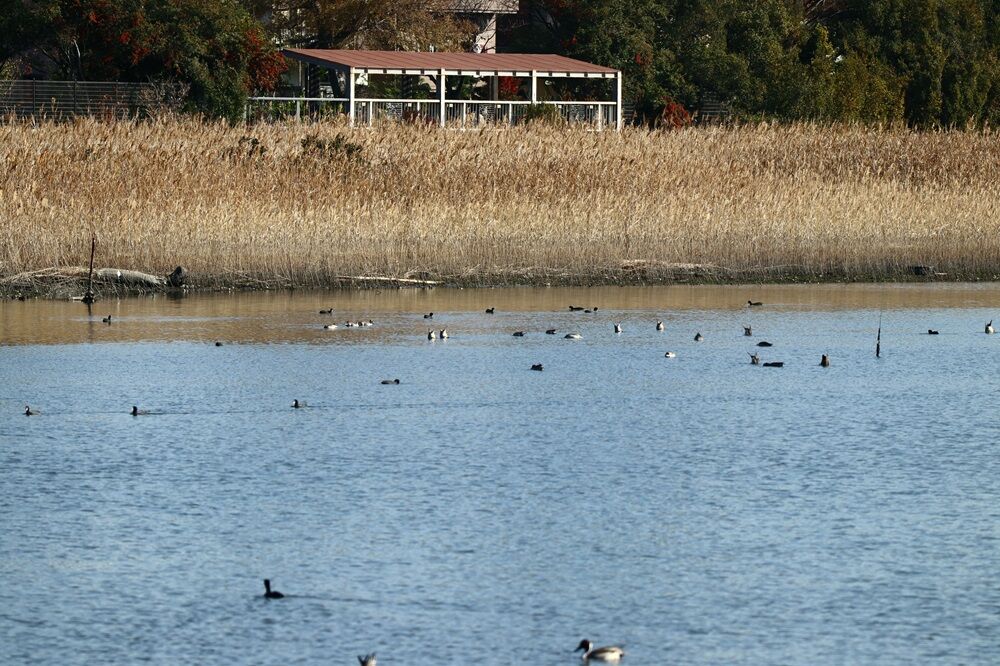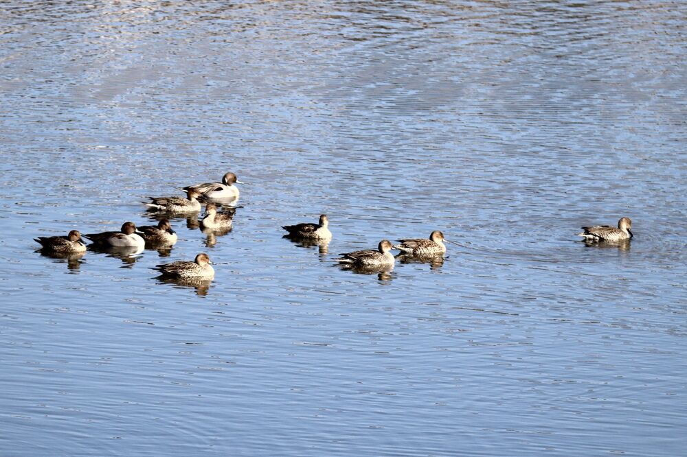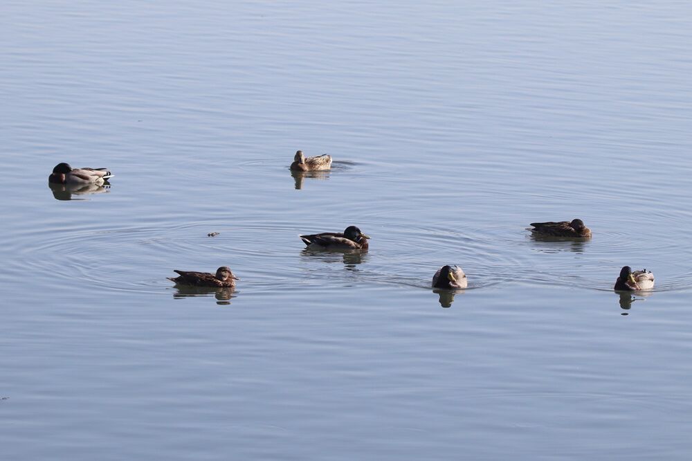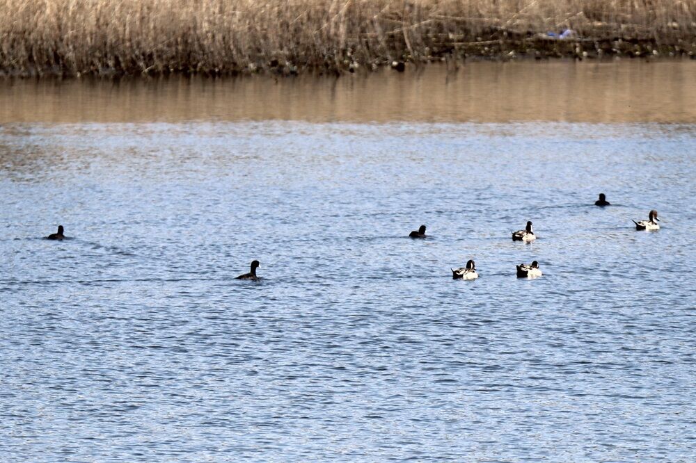 南船橋駅から谷津干潟の遊歩道に入ってすぐのところ、まずはオナガガモの集団がいました。対岸にもカモたちの集団、アオサギがいました。