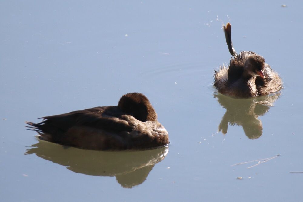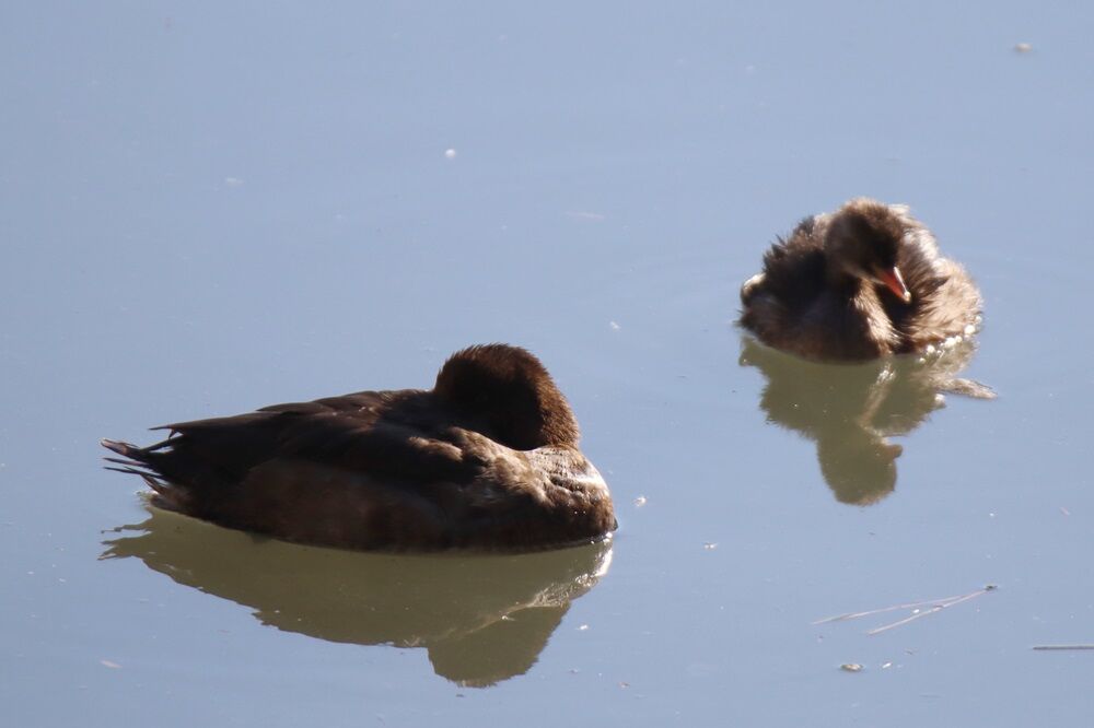 寝ているカモとカイツブリがいました。カイツブリが趾を上にあげました。