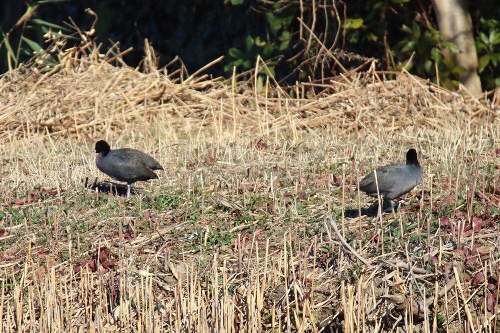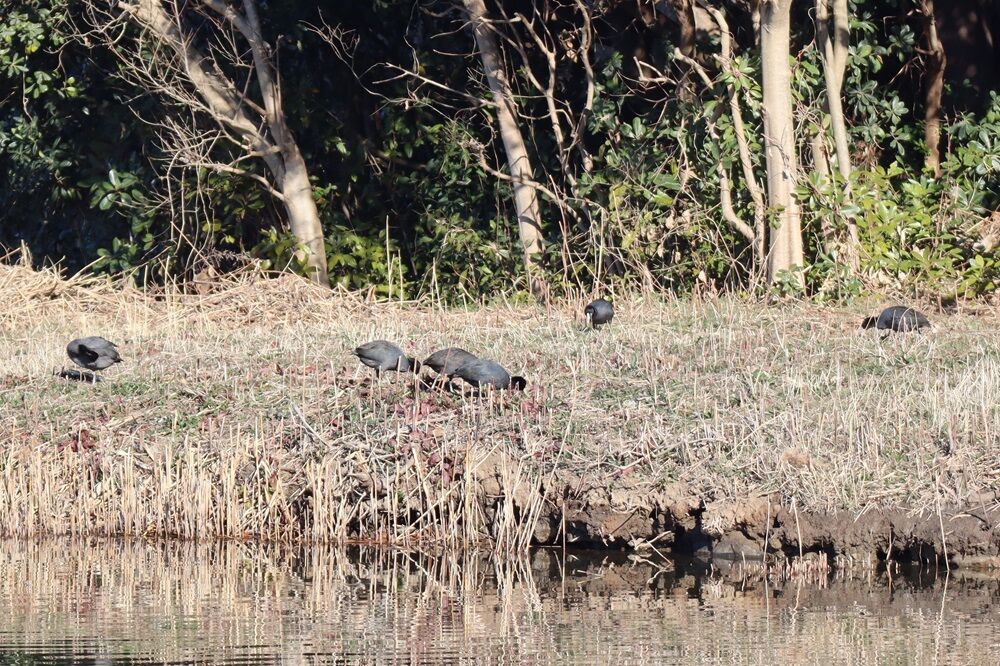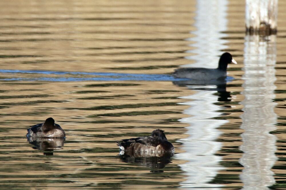 淡水池の上には寝ている2羽のカモとオオバンがいました。先ほどの杭の上にいたアオサギです。