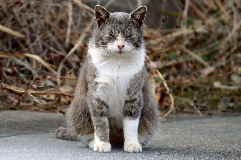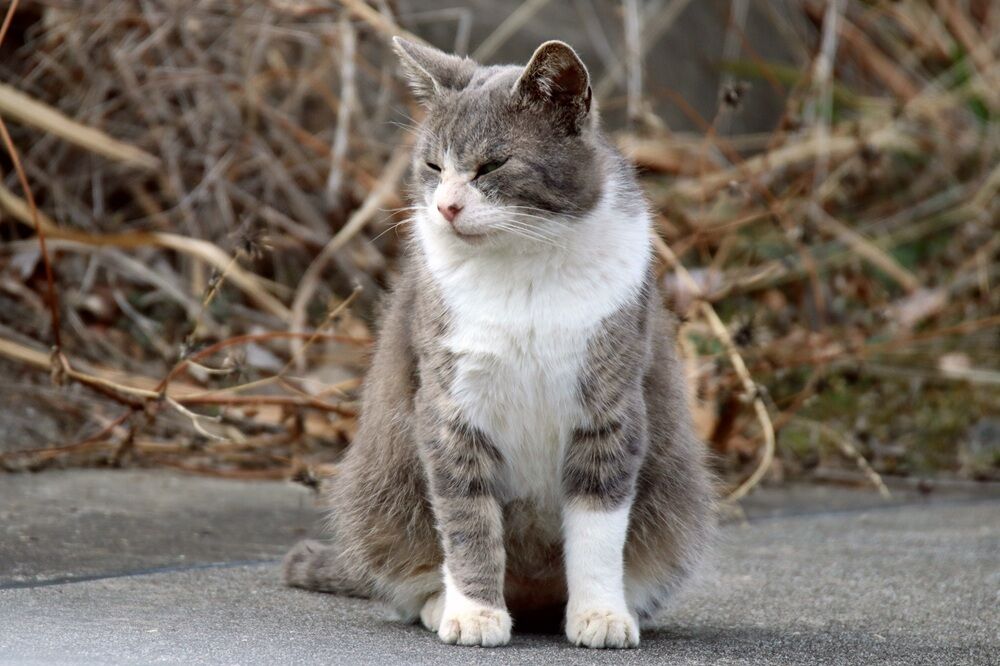江戸川河川敷に来ました。眠そうに座っているネコがいました。