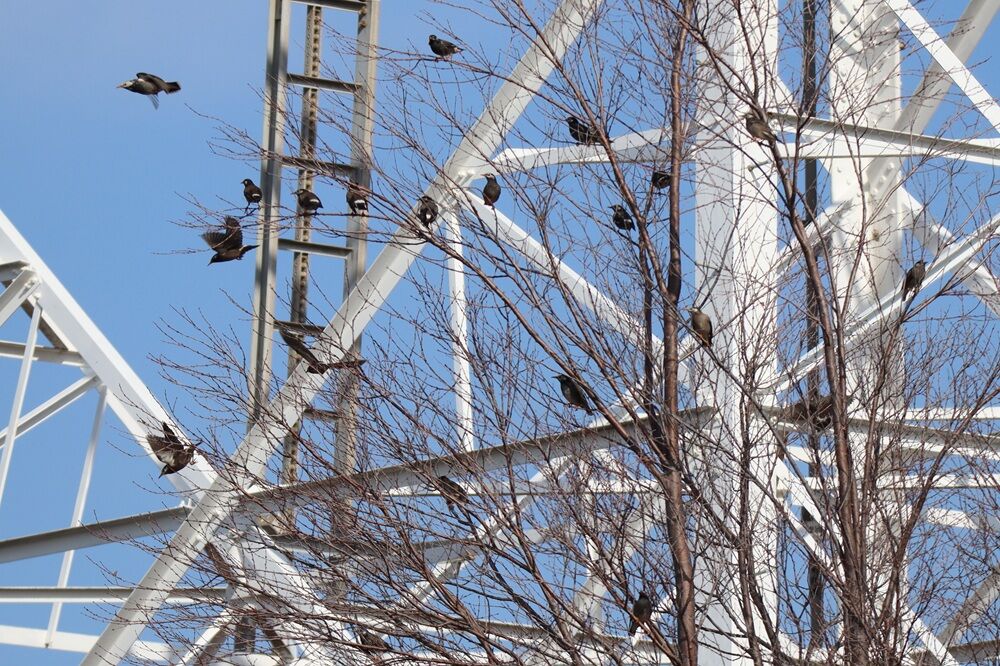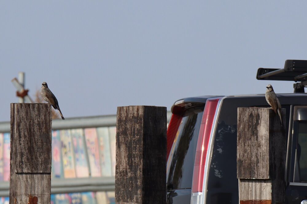 木にはムクドリの集団がいました。近くの杭の上には2羽のヒヨドリがいました。