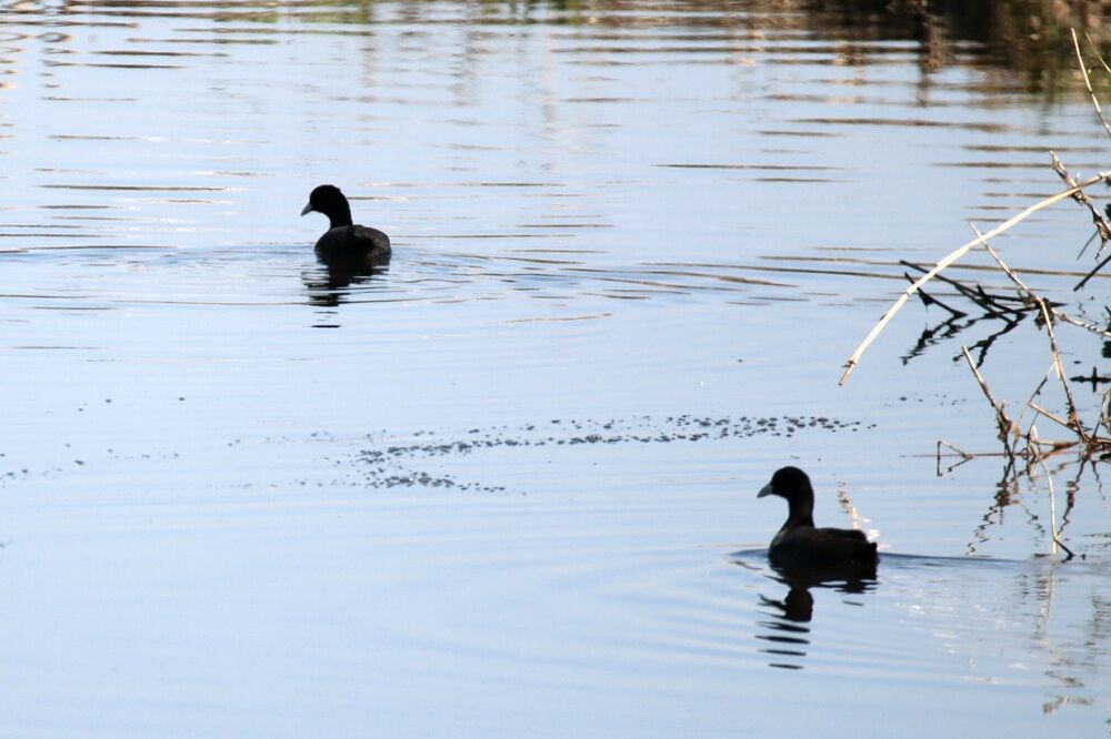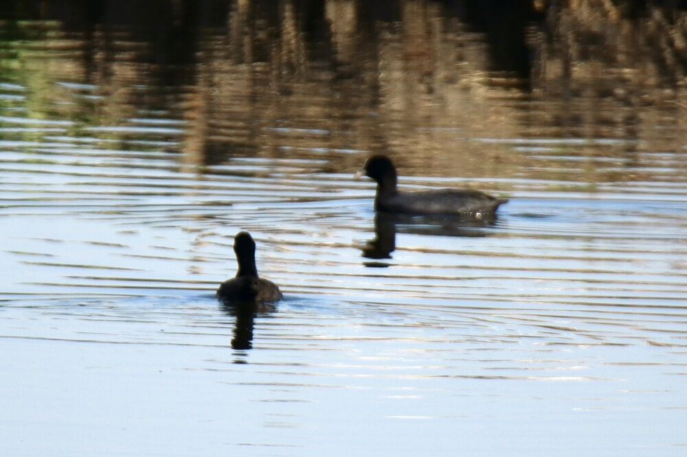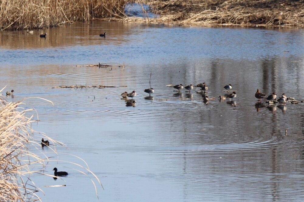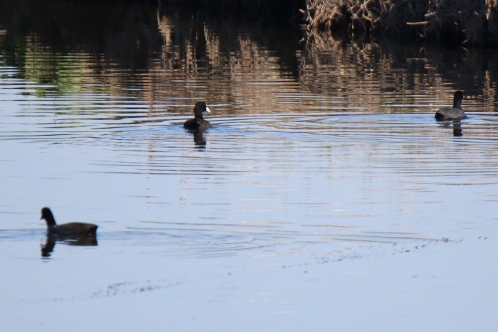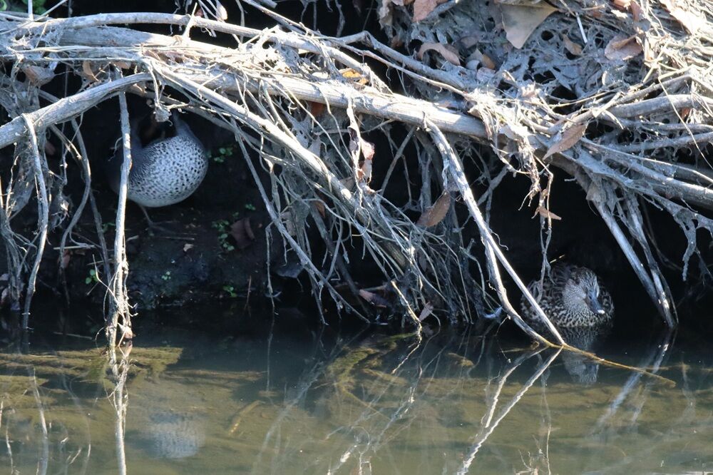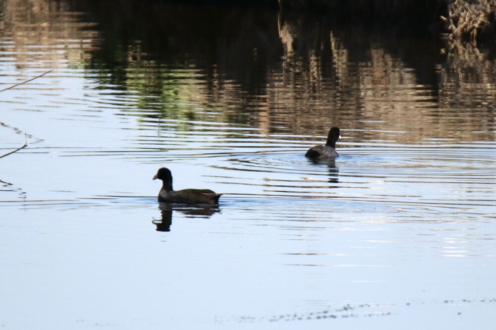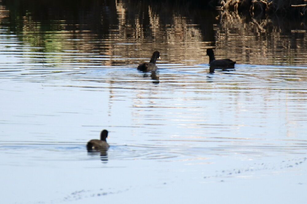 カワセミもいて、上流側の少し離れた場所にはカモたち、オオバンがいました。