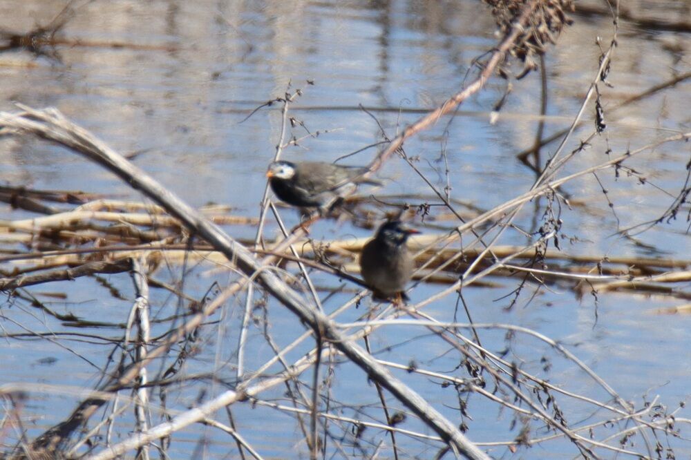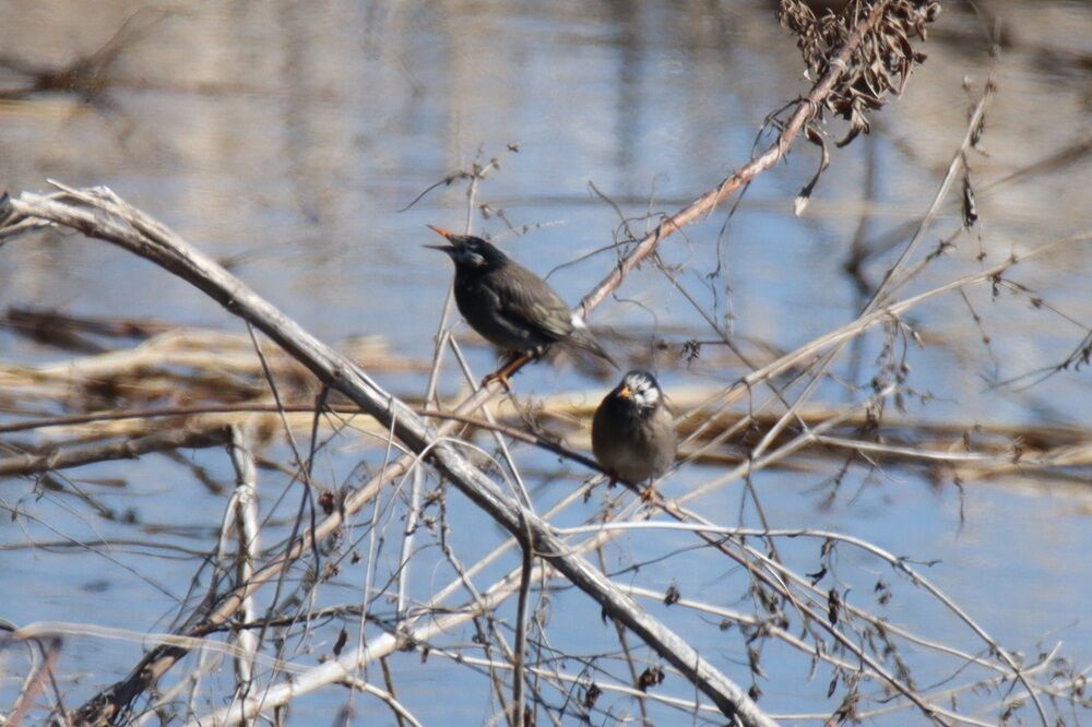 分水路の奥、馬川橋にします。近くの木にはムクドリたちが止まっていました。