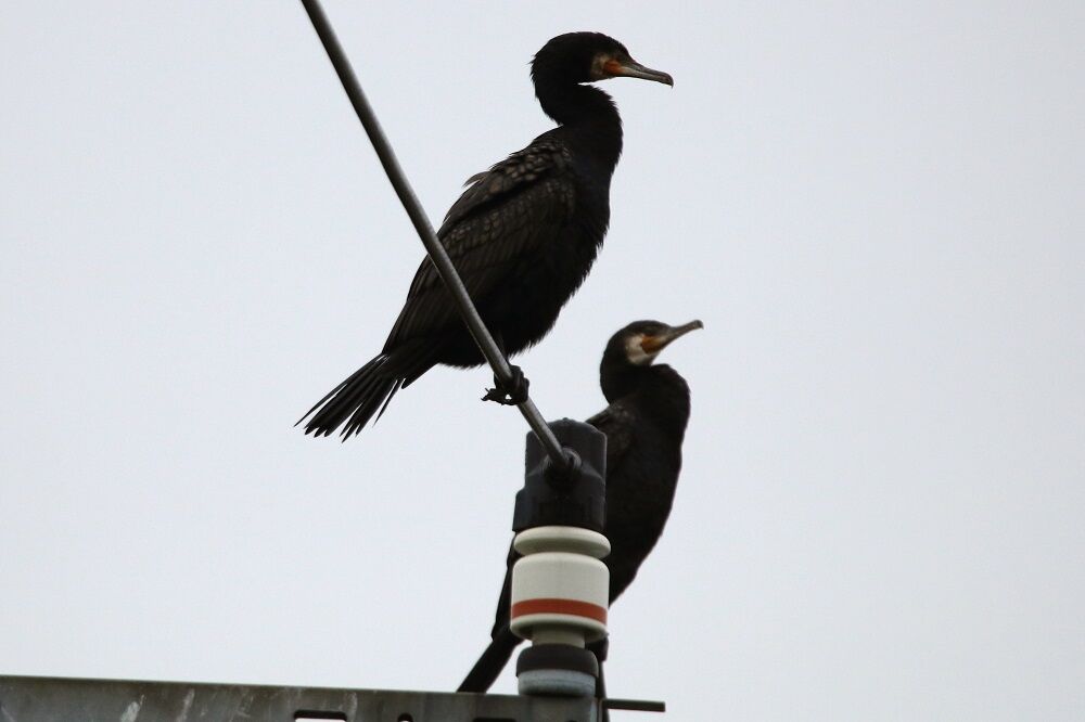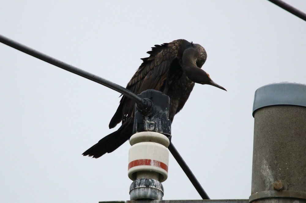分水路の奥に着くとそこにはいつも通りに電柱、電線にはカワウがいます。