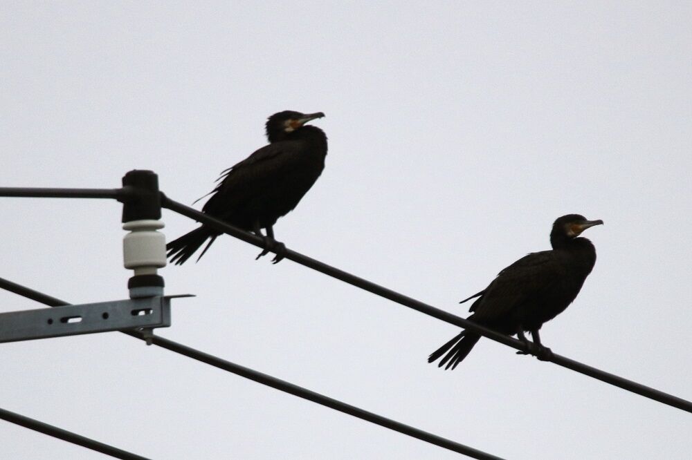 春木川に向かい、高杯橋を渡って少し上流側に進んだ電線には2羽のカワウがいました。