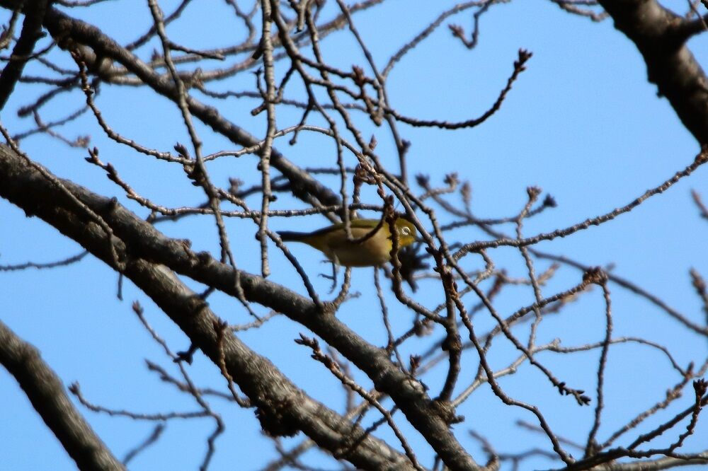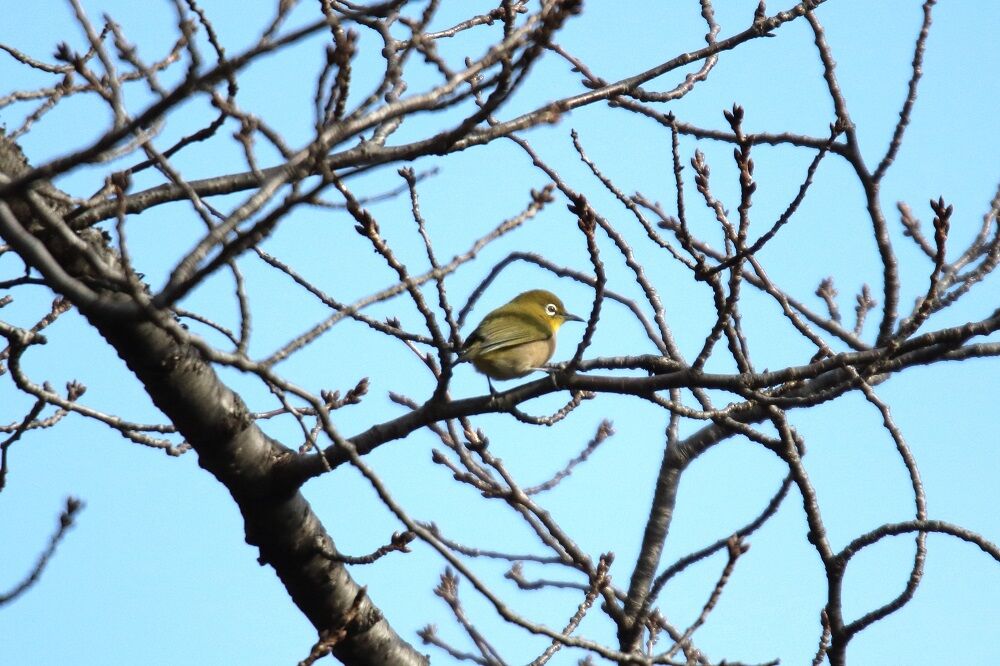 木の上の方で採餌するメジロです。
